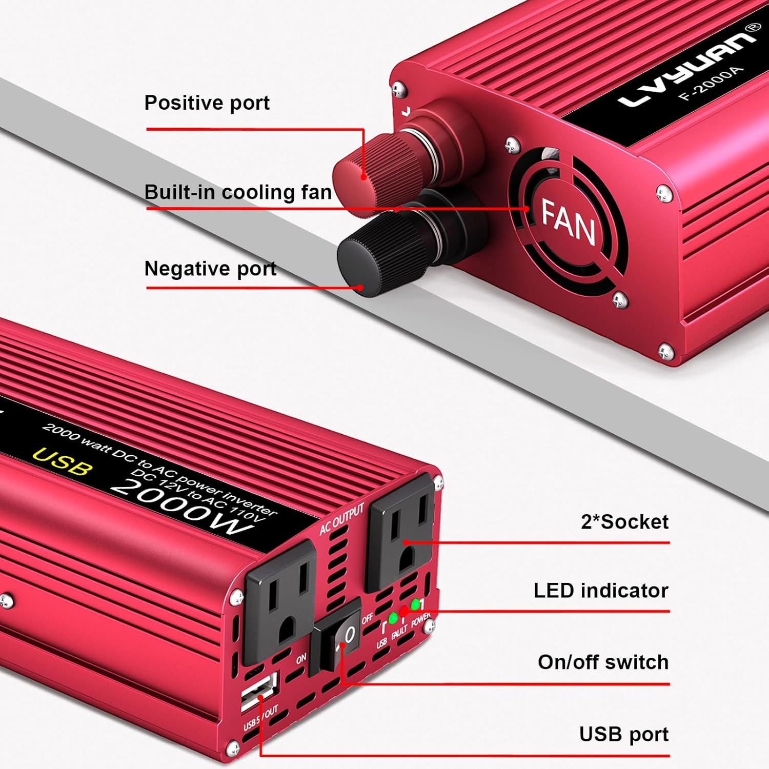 - [Highly Powerful Inverter] The power inverter delivers a continuous DC 12V to 110V/120V AC power, providing 1000 watts of continuous power and 2000 watts of peak power.