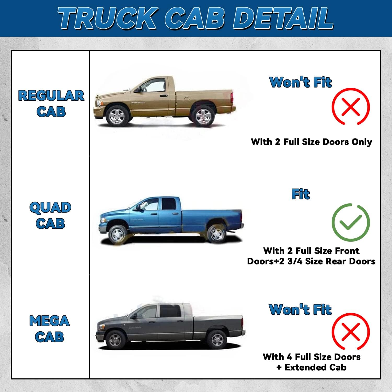- Fit: 2002-2008 Dodge Ram 1500 Quad Cab (AKA Crew Cab); 2003-2009 Dodge Ram 2500/3500/4500/5500 Quad Cab (AKA Crew Cab) (Note:Quad Cab has 2 full size front doors and 2 3/4 size rear doors only)