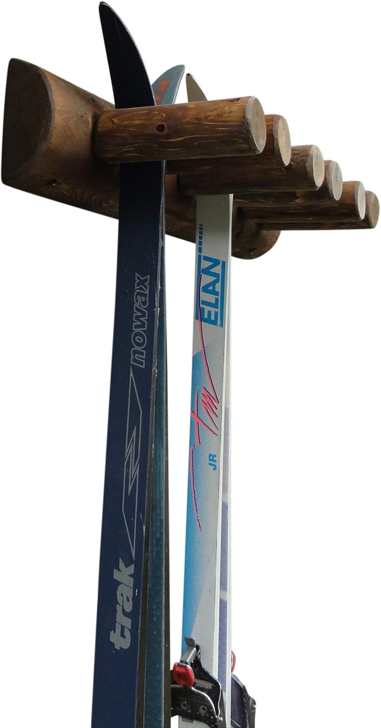 6-Place Log Ski Rack Wall Mount, Indoor Ski Storage Rack for Garage Organizers, Wooden Skis Wall Mount Storage Racks, Pole Skis Sports Racks, Garage Organization Walls - Canyon Brown