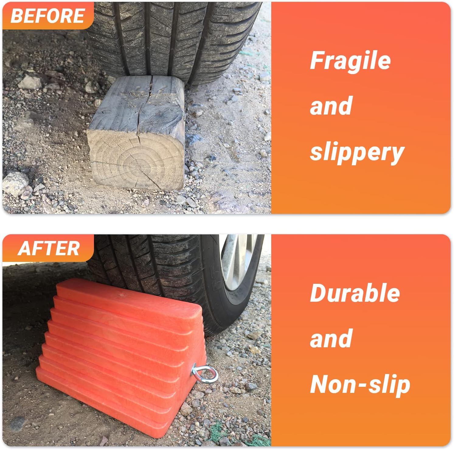 • Ideal Choice: This wheel chocks breaks the conventional black, using the orange series is more eye-catching can keep your vehicle or trailer secure at any time, durable and stylish, is the best choice for wheel chock. Includes 2 Pack; Dimensions: 9.1" x 7.1" x 5.5"