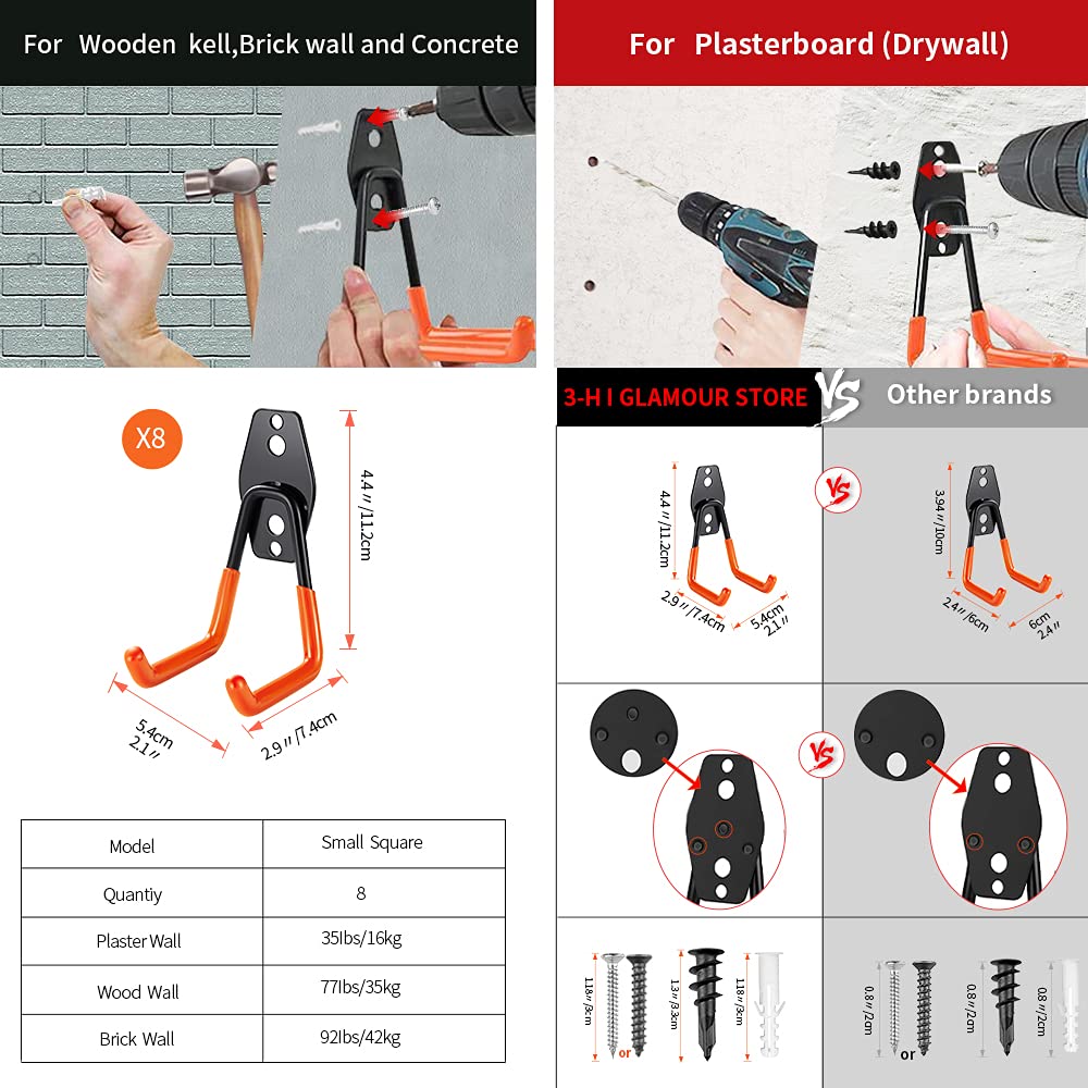 - PERFECT FOR HEAVY OBJECTS βGarage hooks is a set of 8 wall mounted double hooks,8 small U hook . The extended length and anti-slip coating let you organise and hang heavy objects for up to 80lbs.