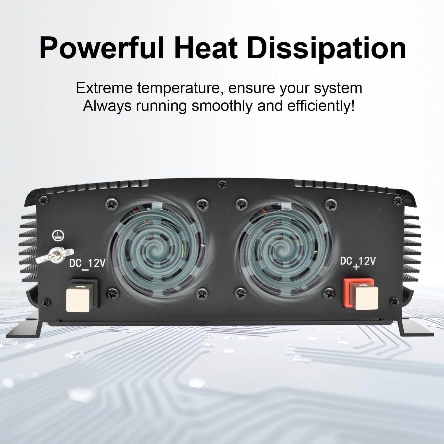 - 4.【Smart& powerful cooling fan】The built-in 3 powerful fans of the 12volt solar power inverter ensure fast heat dissipation. Smart cooling fan system only works when the device gets warmer or output power exceeds, slows down and stops working when the temperature gets down. which makes the power inverter work silently most of time.