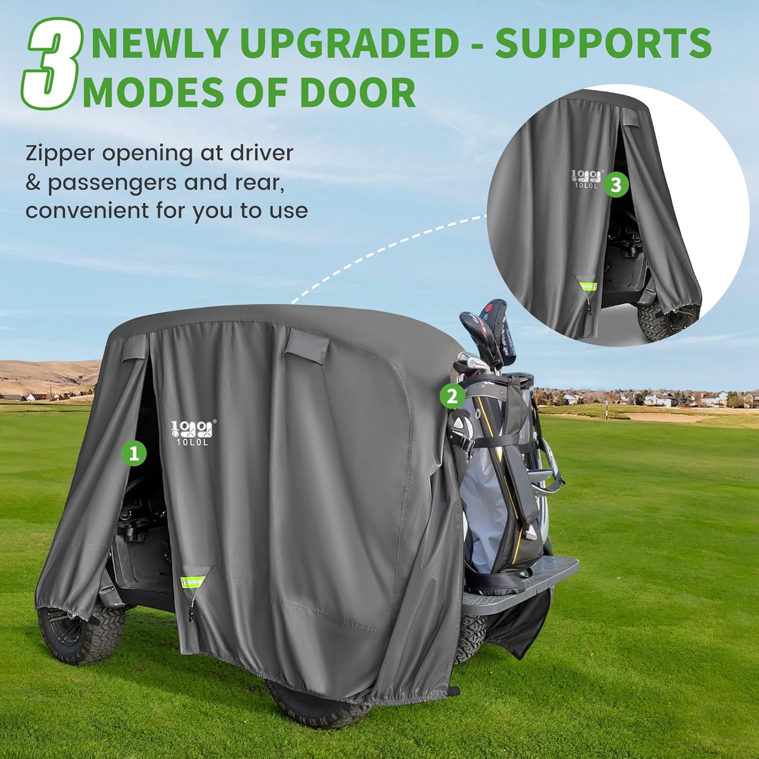 - The side and rear door zippers make it easy in/out access to golf cart while covering, 4 air vents keeps your cart breathable and dry, 2 reflective strips for safe parking at night