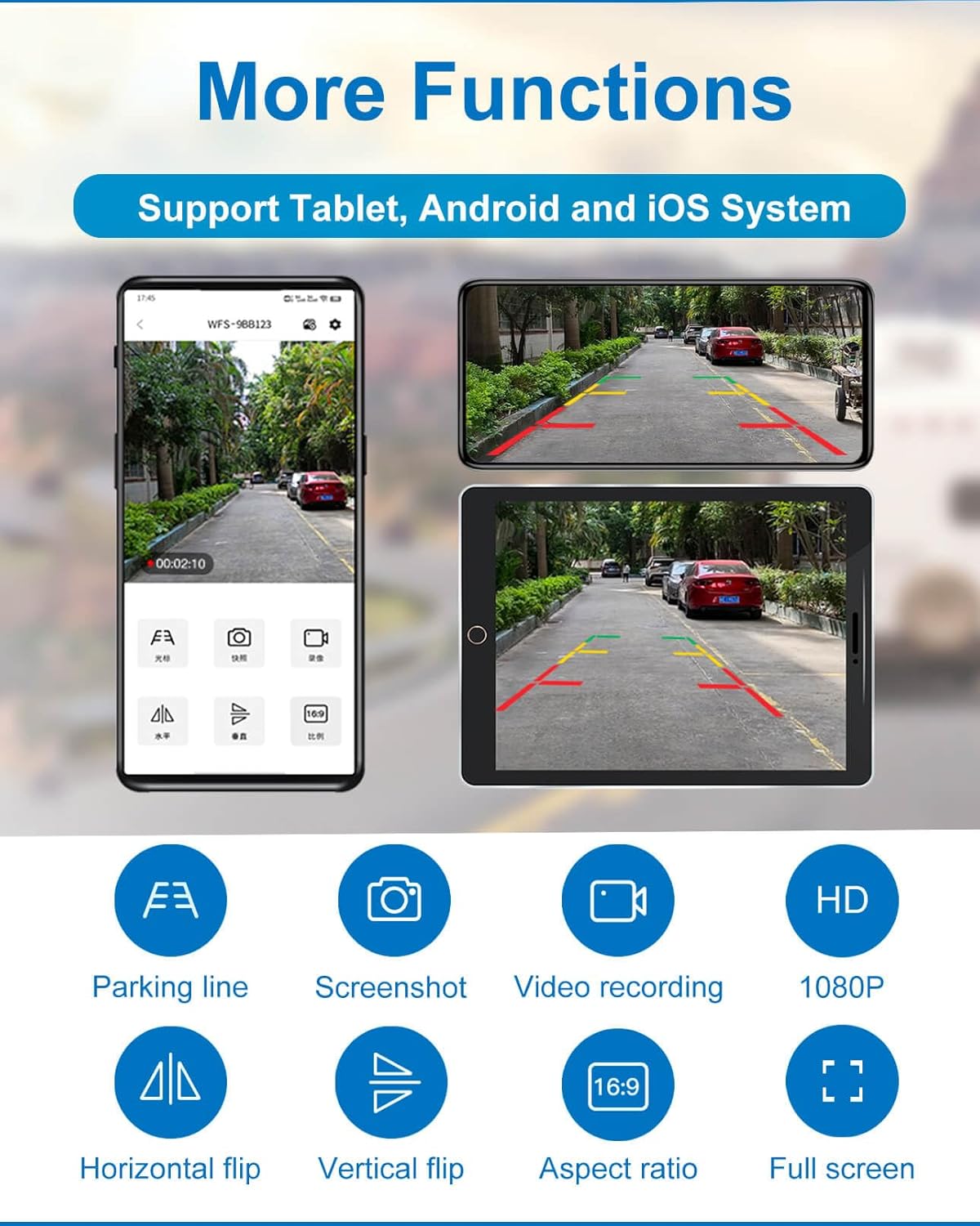 - ăStable WiFi ConnectionăThis wireless backup camera ensures a reliable hotspot signal, covering distances of up to 197FT/60m without obstacles. It's perfectly suited for vehicles under 30ft in length (Note: Transmission distance may vary based on vehicle type and environment). The camera can be conveniently powered via USB