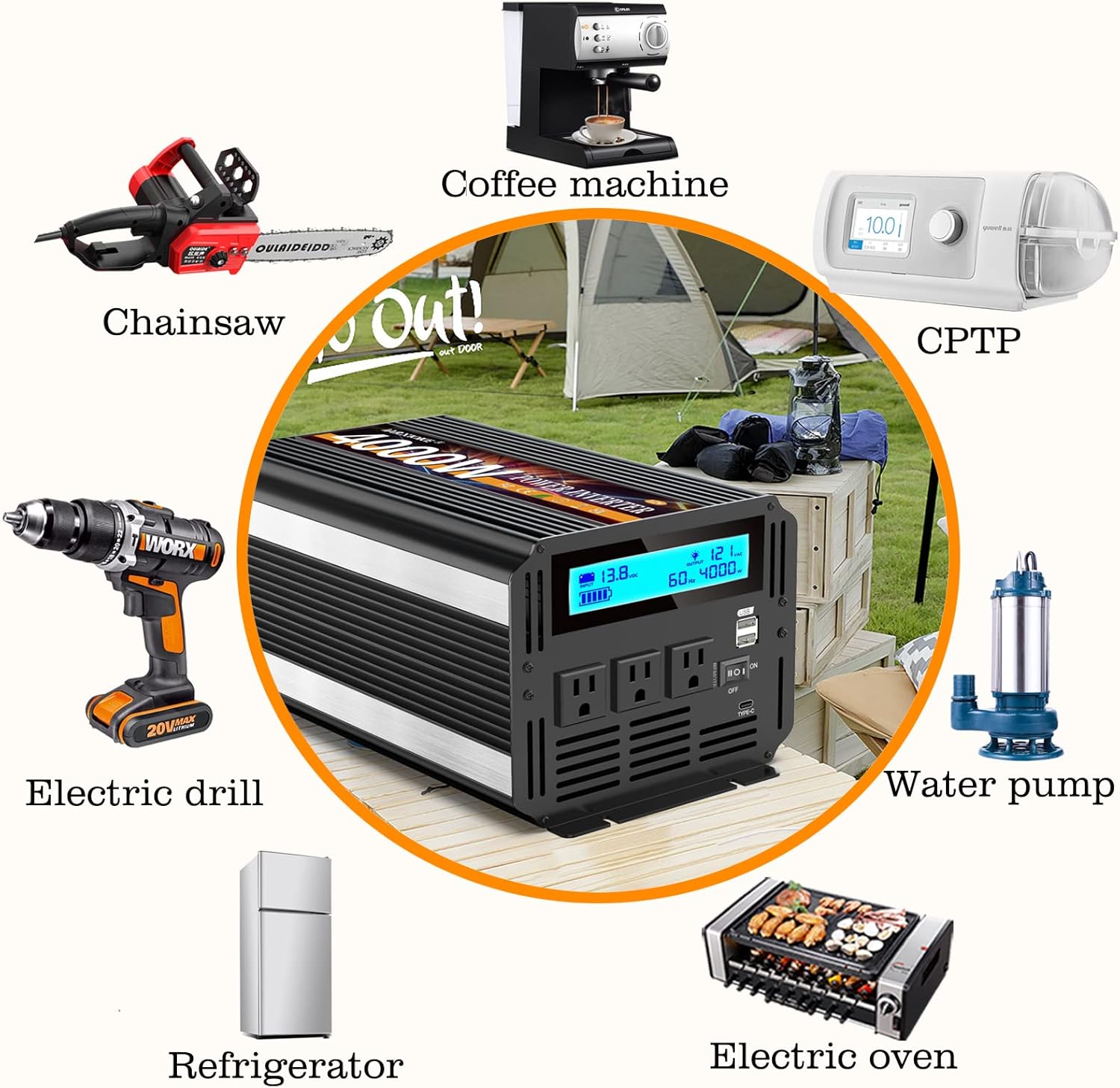 4000 Watt Power Inverter 12V DC to 110V 120V Converter for Family RV Off Grid Solar System Car with Type-C Ports 3 AC Power Outlets Dual USB Ports LCD Display Wireless Remote Control