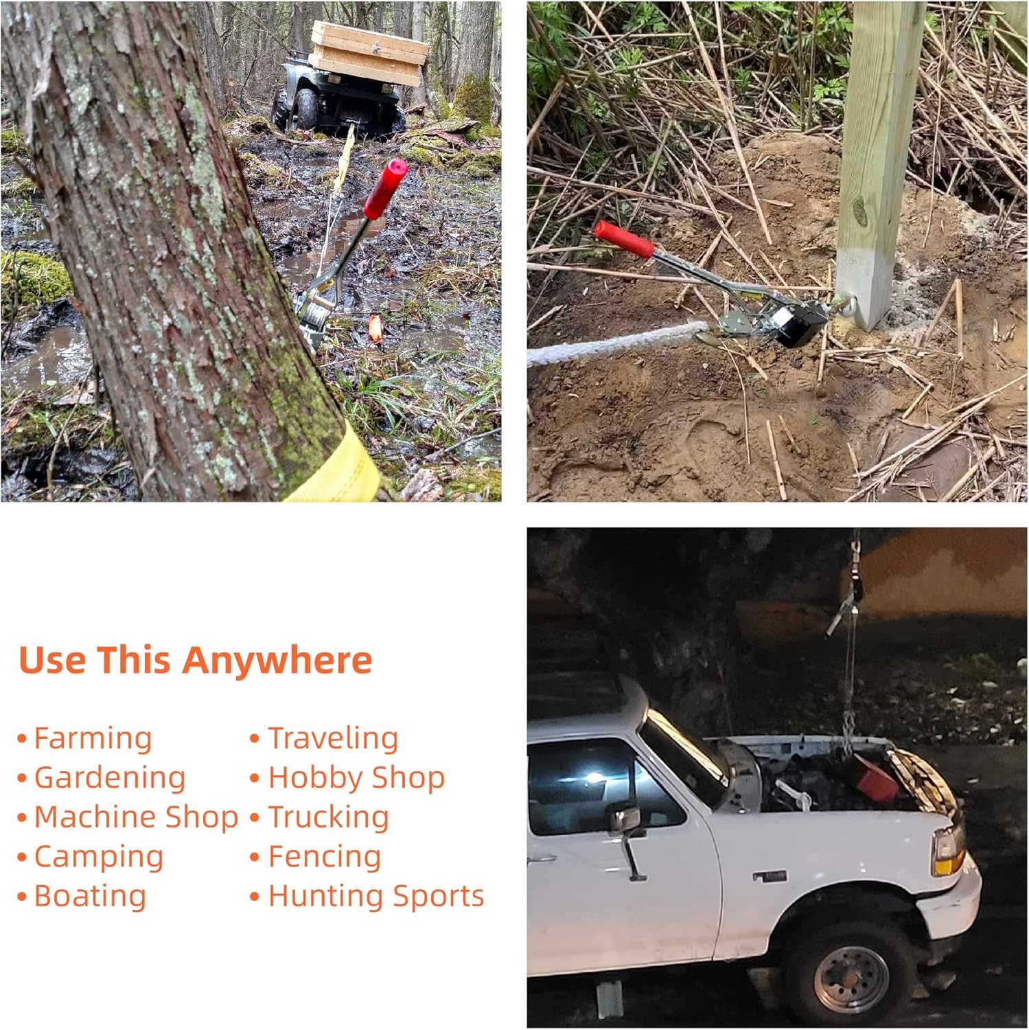 - ONE HANDED: The come along tool features dual laminated steel ratcheting gears pulley and double locking pawl that distributes even pulling force allowing you to use only one hand while pulling heavy loads. High-Leverage steel ratchet handle system with cushioned nonslip grip. You have more space to comfortably apply force and pull the load more easily.