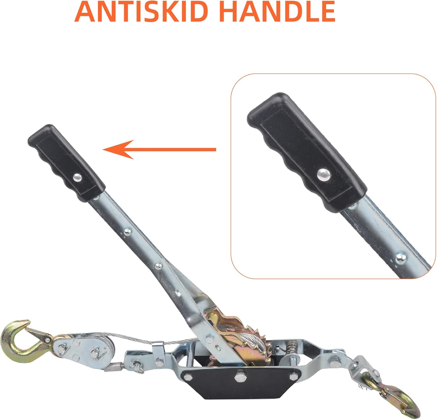 - ONE HANDED: The come along tool features dual laminated steel ratcheting gears pulley and double locking pawl that distributes even pulling force allowing you to use only one hand while pulling heavy loads. High-Leverage steel ratchet handle system with cushioned nonslip grip. You have more space to comfortably apply force and pull the load more easily.