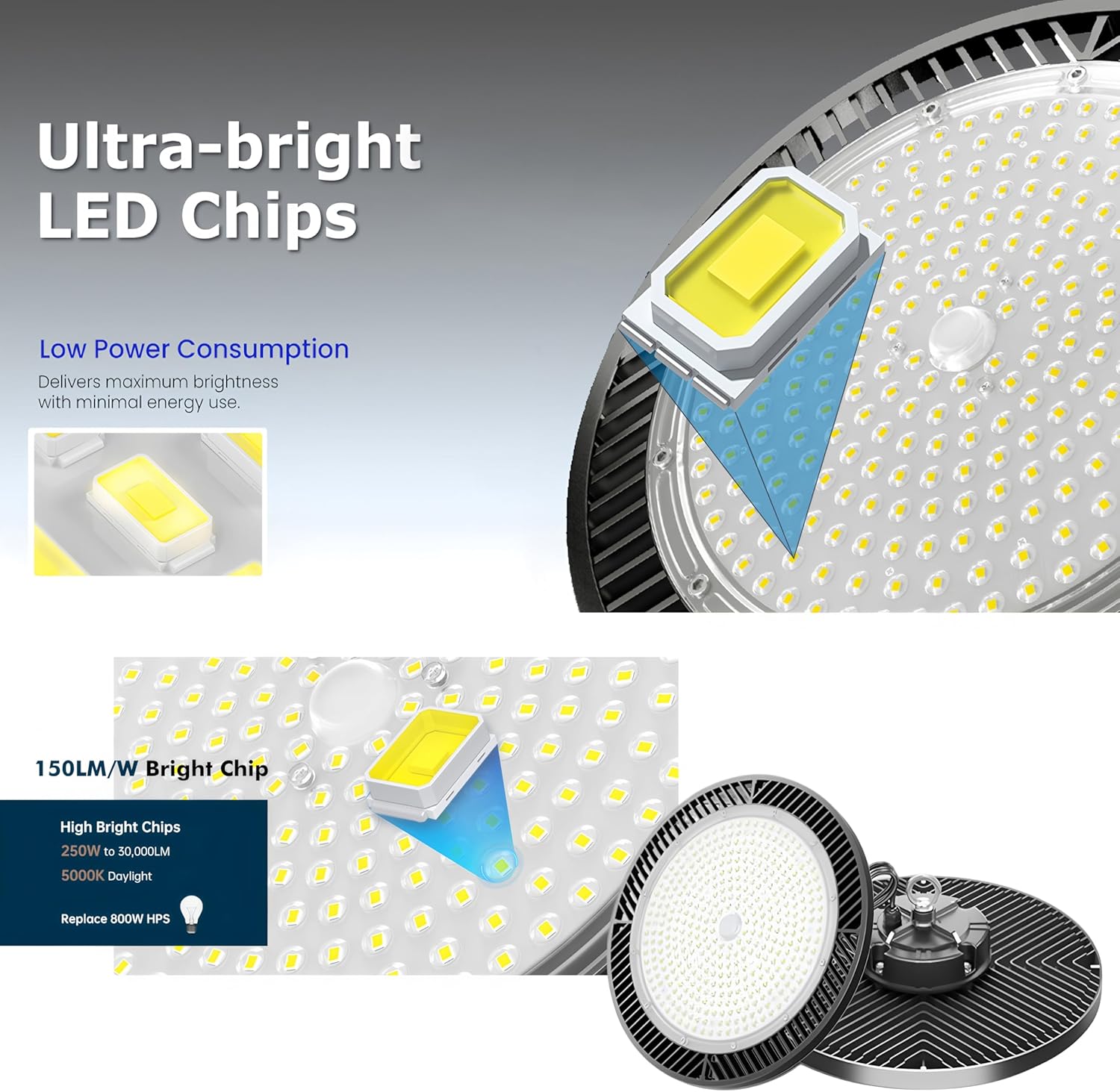 - ✔️【Led High bay Light 250W details】It features LED technology top quality diodes that total 30000 lumens,CRI80+,250W, 6000K daylight for your garage, warehouse,providing the best indoor lighting experience.