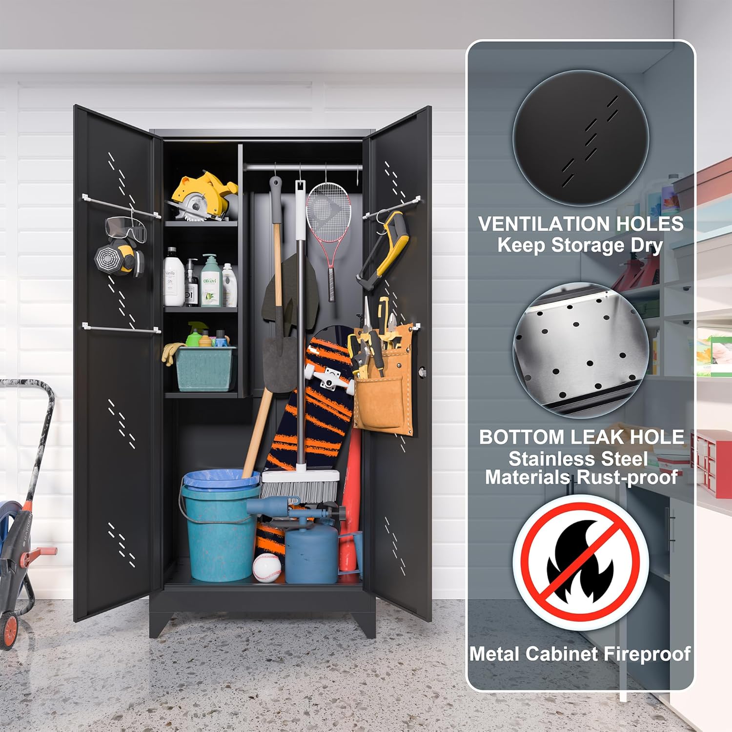 - Unique Design:The metal storage cabinet has holes in the bottom,anti-rust material.You can put wet mops and brooms in this broom storage cabinet.Make your tools and room more tidy.As a large cleaning cabinet, you can store mops, brooms, car cleaning tools, vacuum cleaners, carpet cleaning cabinet tools, etc