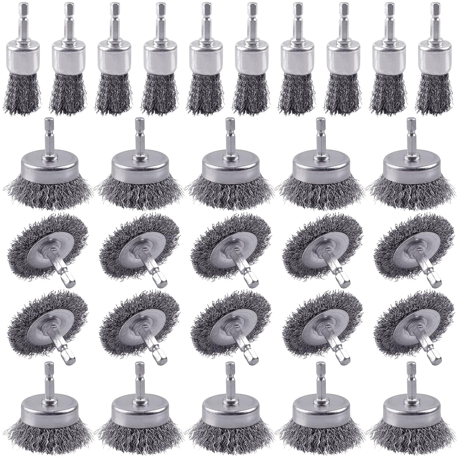 - 30 Pack Wire Brush Set: This package includes: 10 pcs carbon steel cup brush, 10 pcs wheel brush, 10 pcs pen brush with 1/4 inch hex shank. Hardened steel wire long maximum 4500 RPM.