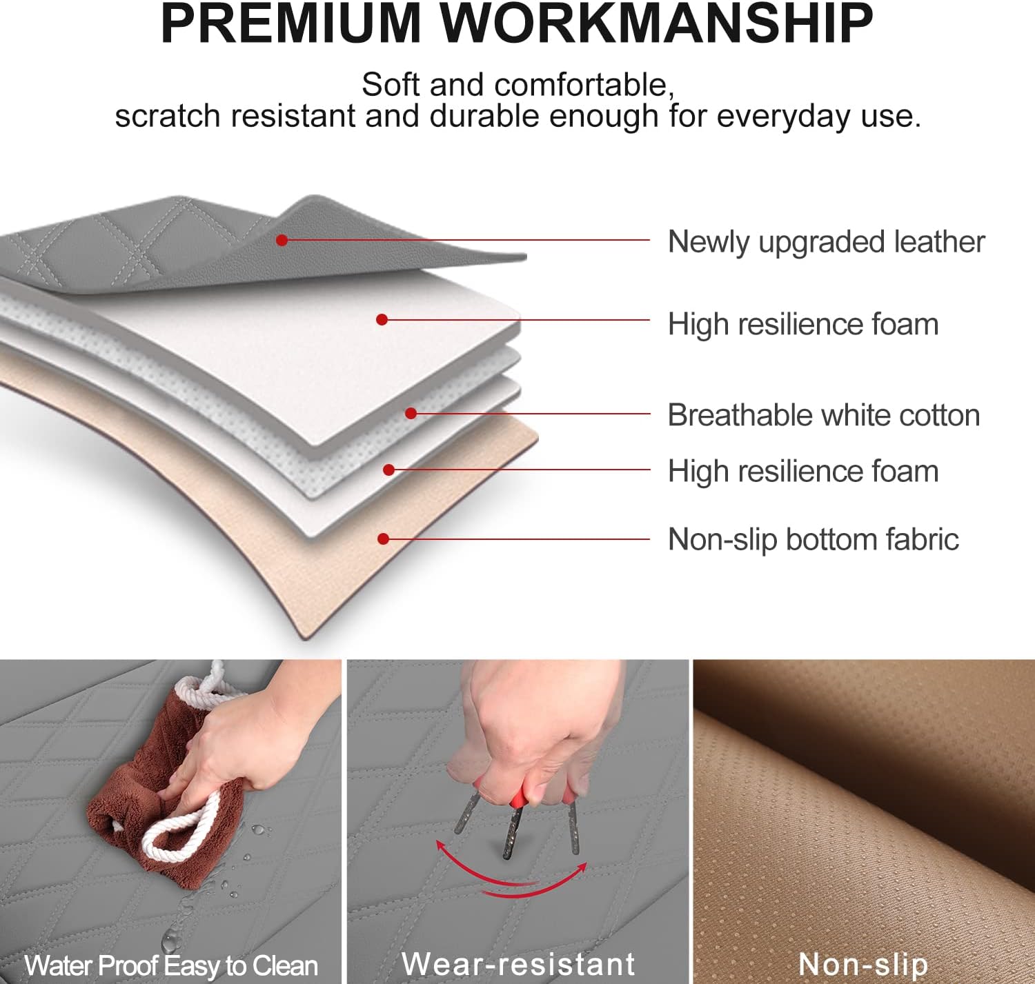 - PU Leather Soft & Durable: Our bottom seat covers for cars are made of soft PU leather, providing soft and durable protection for your car interior for long-term use. A built-in layer of elastic sponge provides maximum comfort for your hips during your driving. When the bottom car seat covers get dirty, just wipe them gently with a dry towel.