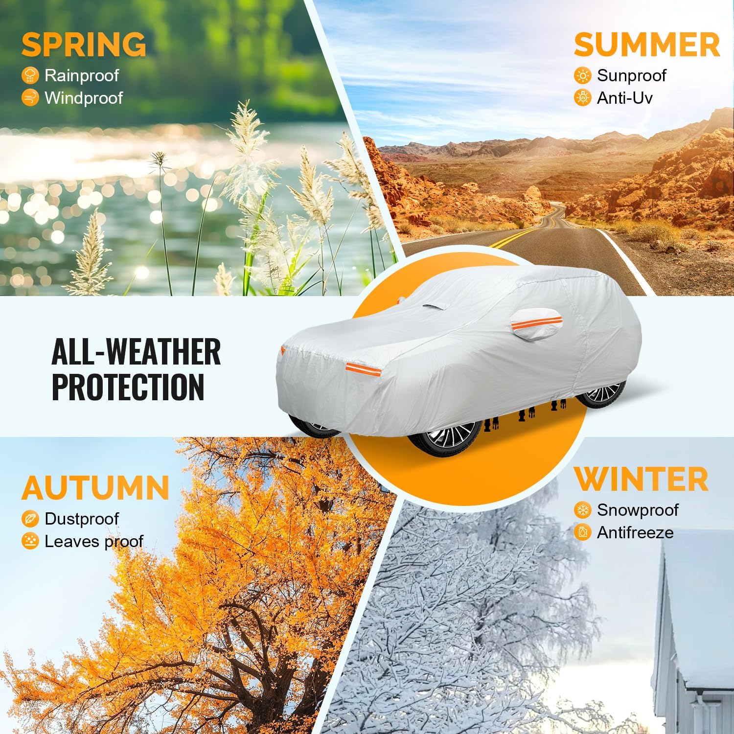 - Coverage : Full exterior coverage for cars, sedans, SUVs, and trucks