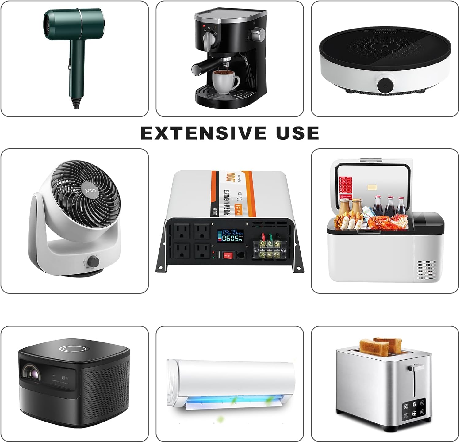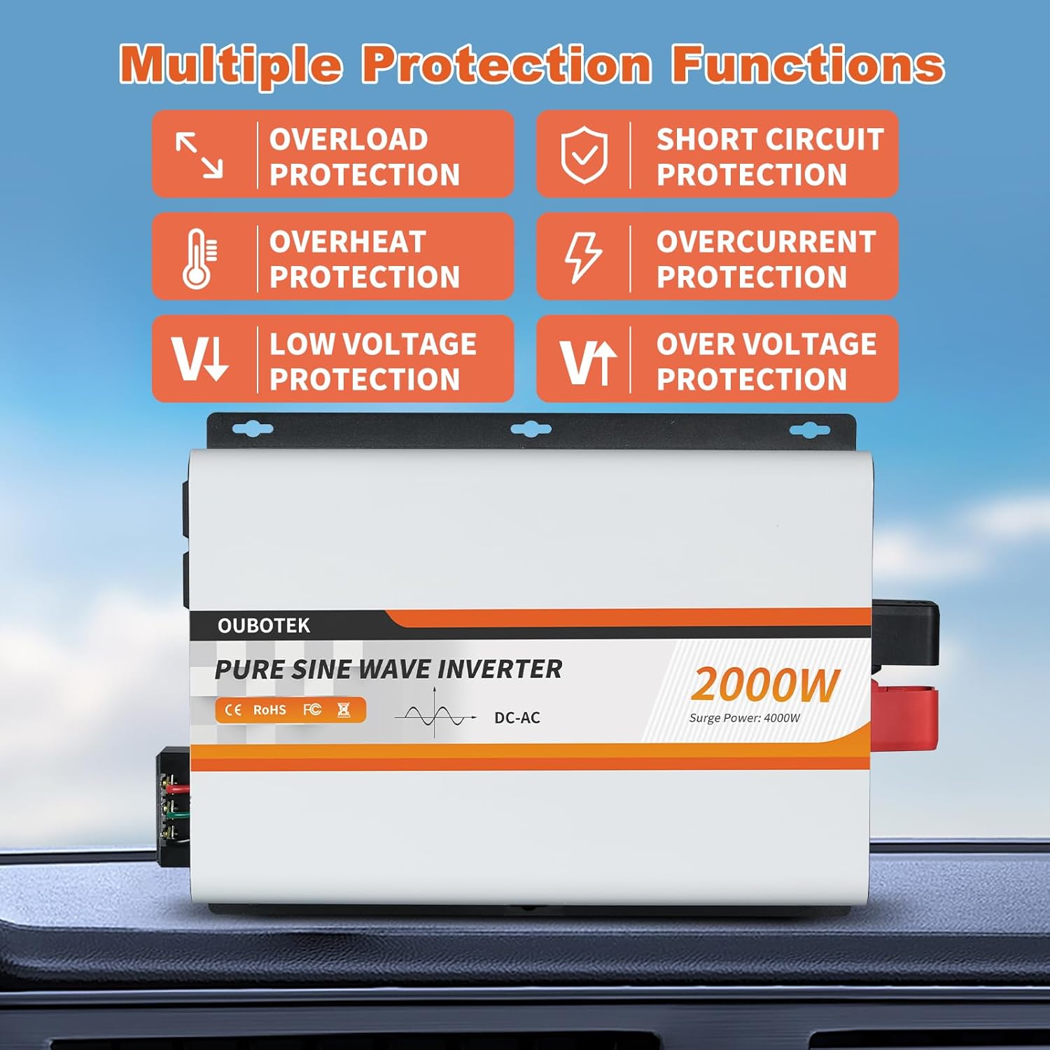 - POWERFUL 2000 WATT INVERTER: The OUBOTEK power inverter provides a stable 2000W continuous power and 4000W peak power DC12V to AC120V clean pure sine wave power delivery with high efficiency. This makes it perfect for powering sensitive electronic devices and appliances.