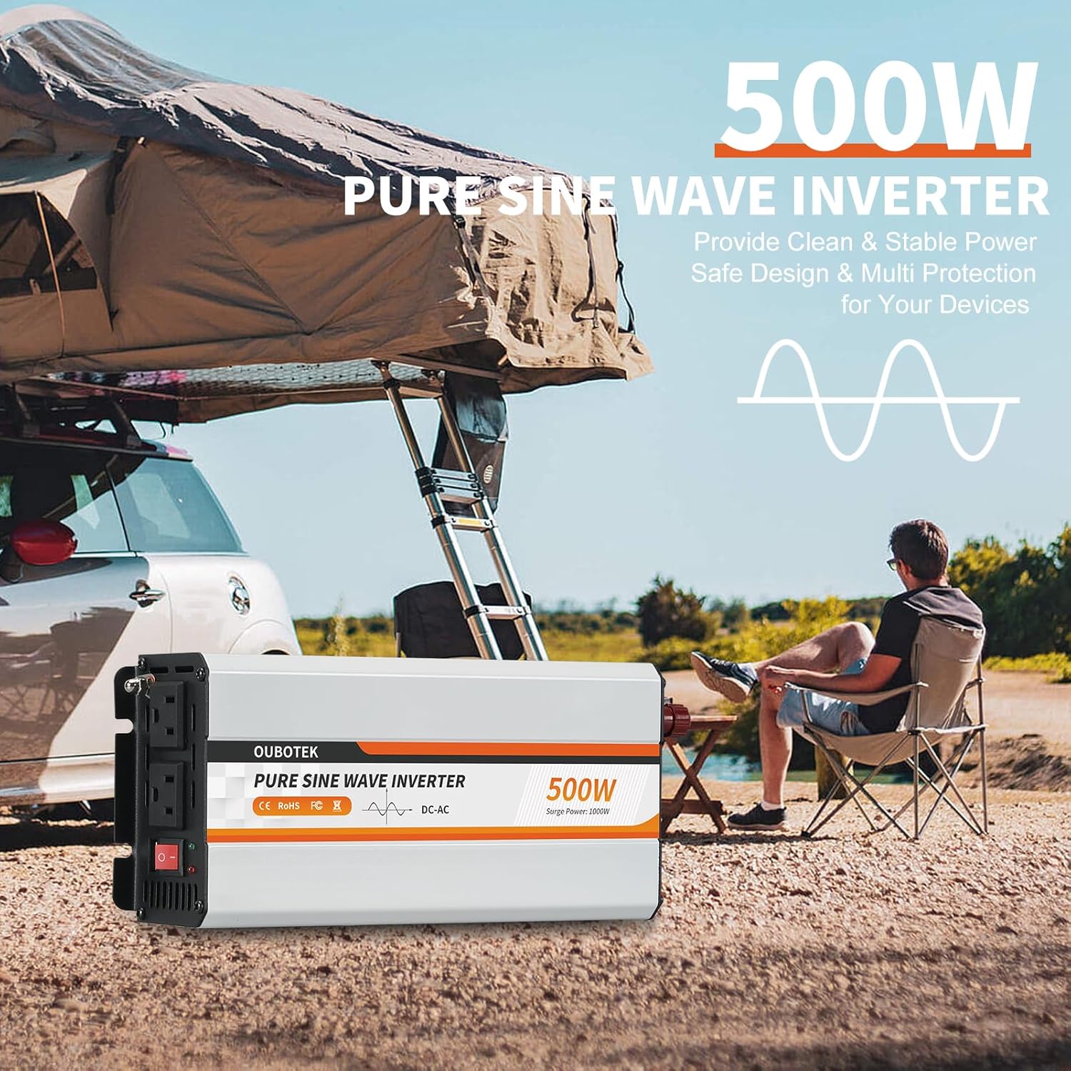 - 500 WATT PURE SINE WAVE: Provides 500W continuous power and 1000W peak power DC12V to AC120V pure sine wave clean and stable power output. This is ideal for powering sensitive electronics and ensures that your devices are protected.
