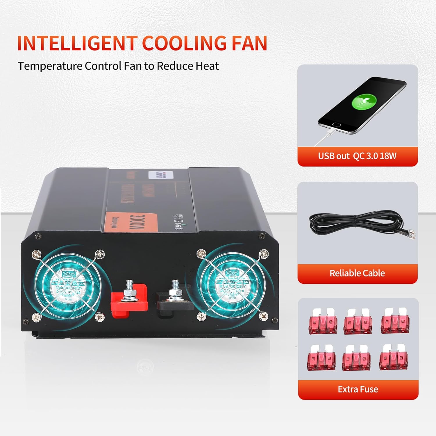 3000W Pure Sine Wave Inverter 12V DC to 120V AC Converter for Home, RV, Truck, Off-Grid Solar Power Inverter with Built-in 5V/2.1A USB, Reliable Cable, Remote Controller