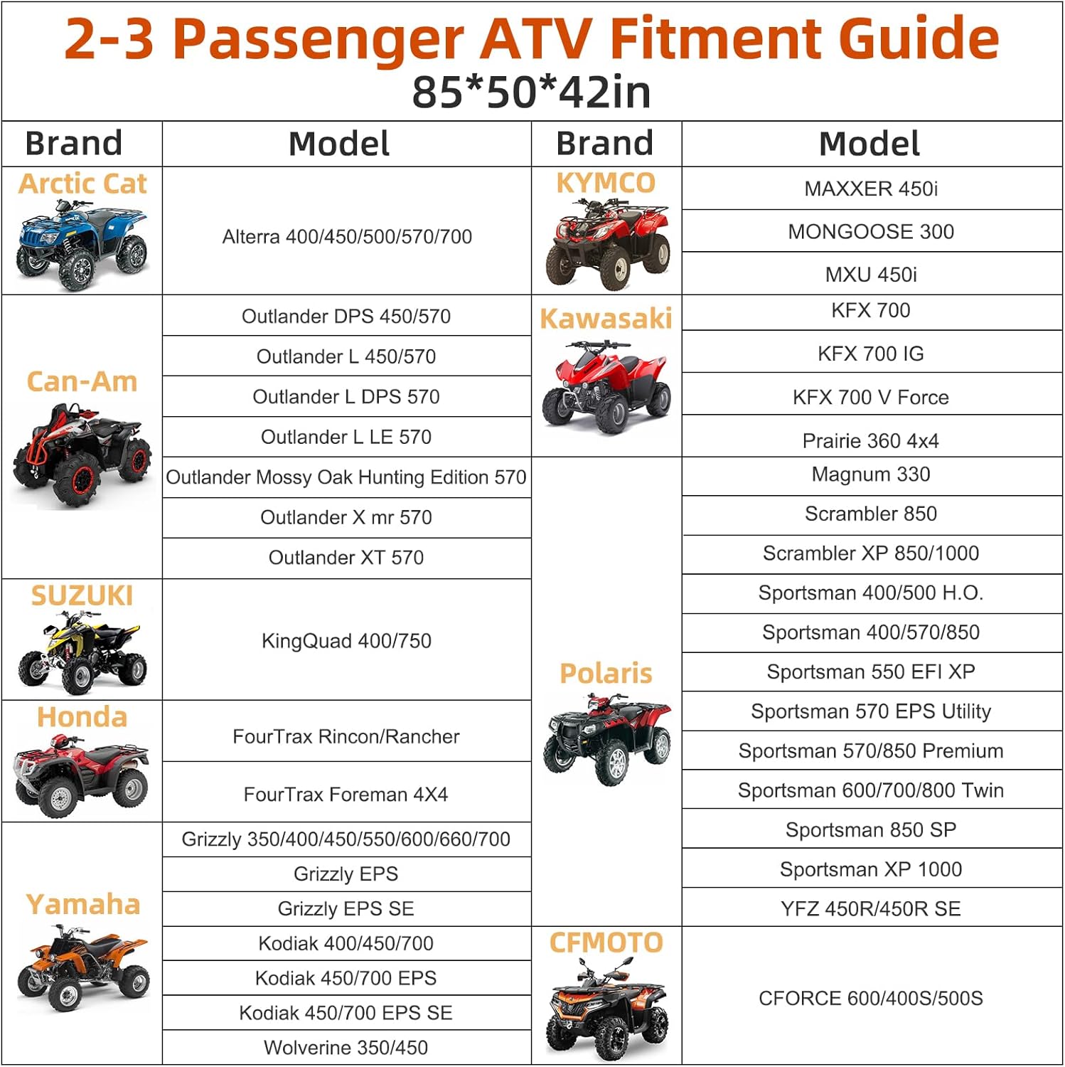 - 【Universal four wheeler Models】:The cover size - 85" L x 50"W x 42" H fit for most ATV, suit for Arctic Cat, Can-am, Cfmoto, Honda, Kymco, Polaris, Suzuki, Yamaha ATV and more(To ensure the right size, please measure your ATV before purchasing)