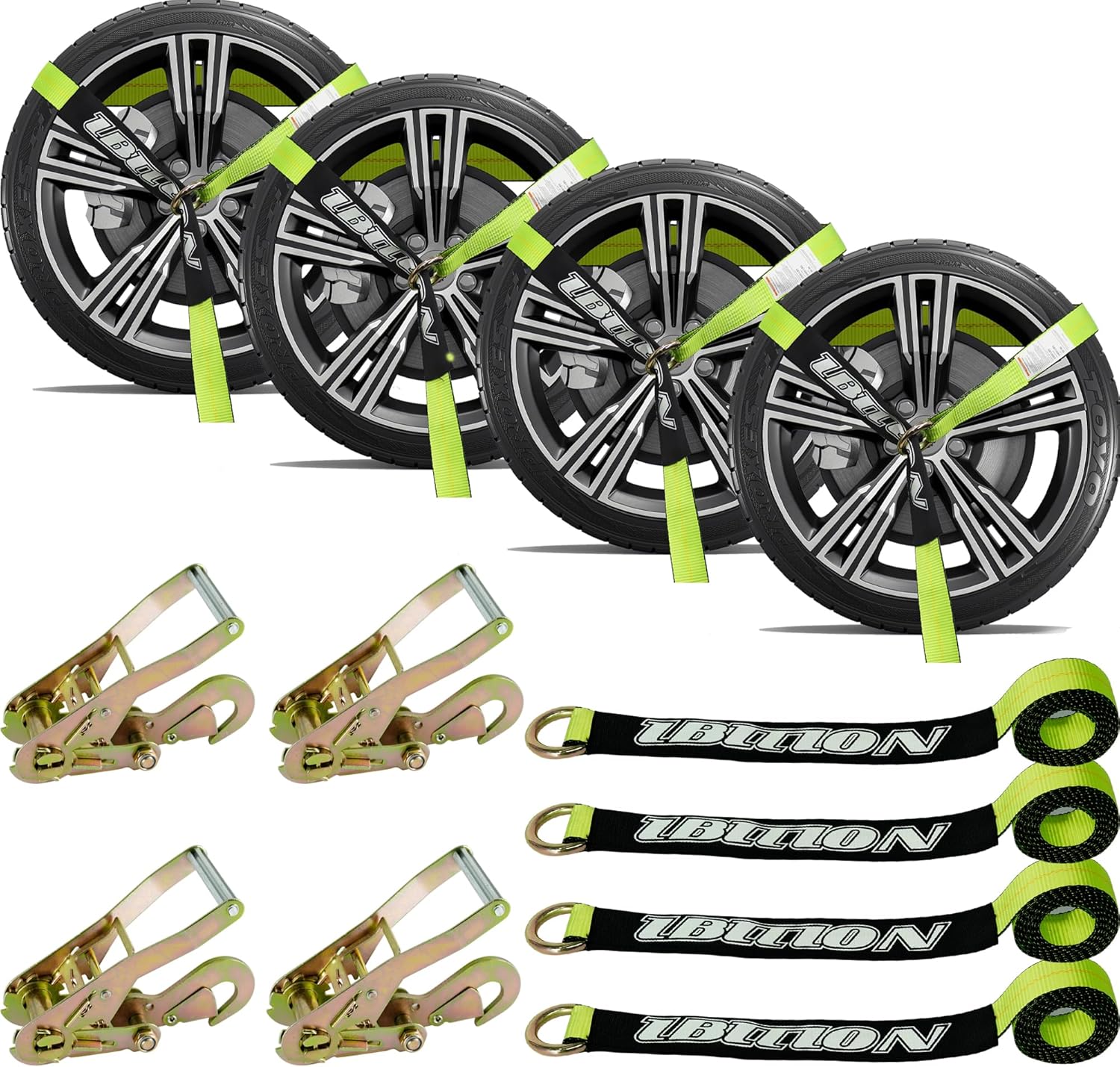 4 Pack Car Tie Down Straps for Trailers - 2" x 96" - 3,300 lbs Safe Working Load -Adjustable Wheel Straps for Hauling Cars.Green