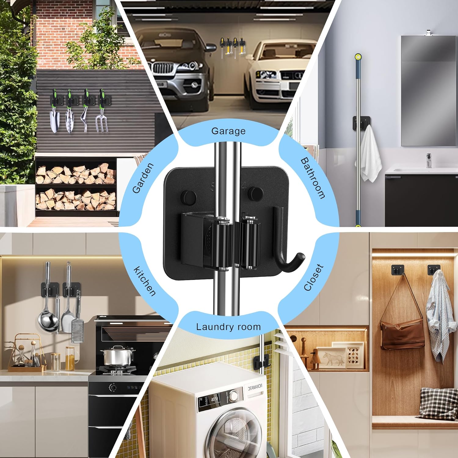 4 Pack Mop and Broom Holder Wall Mount - Stainless Steel Broom Mop Hanger - Wall Mounted Garden Tool Rack Organizer for Closet Garage Laundry Room Kitchen Decor (Black)