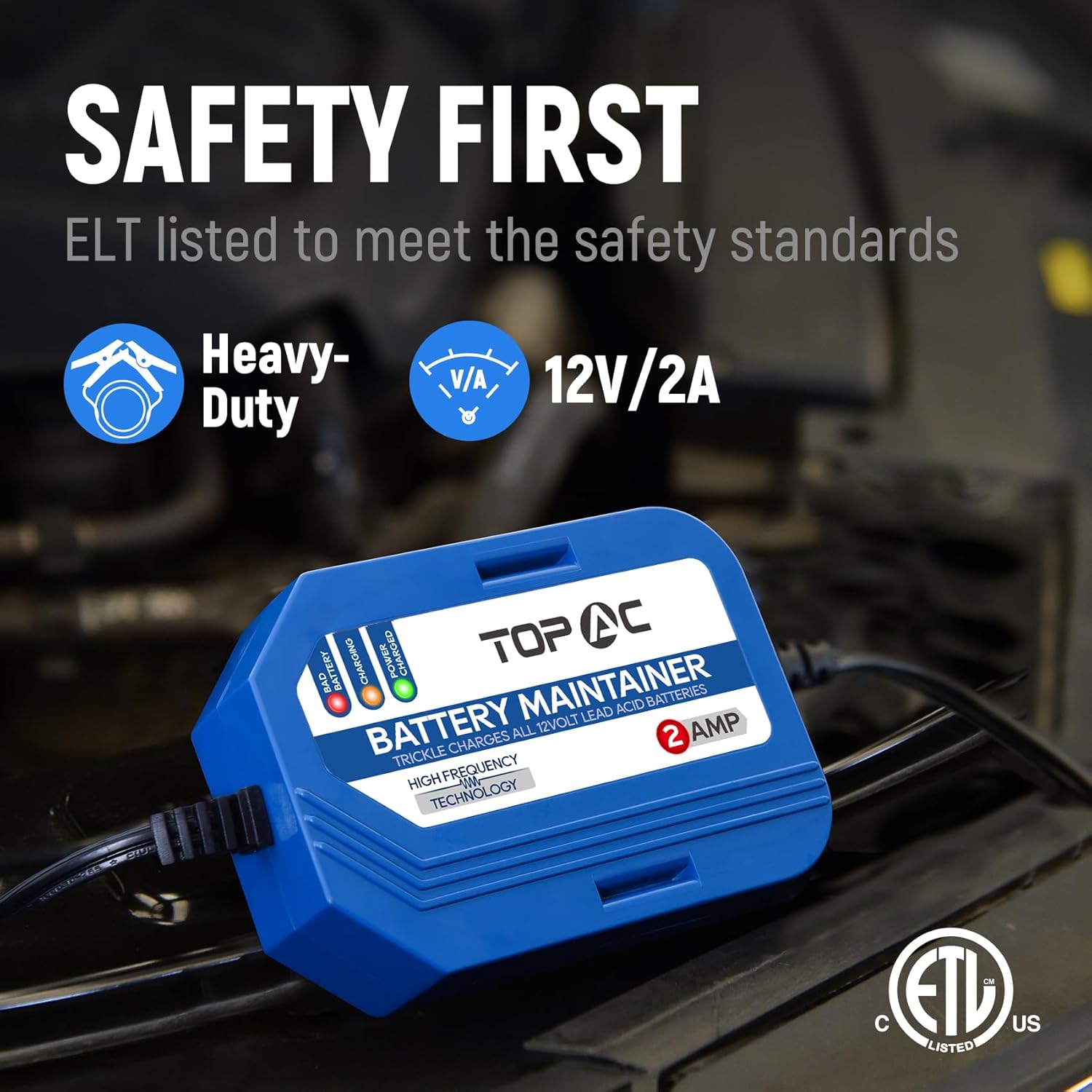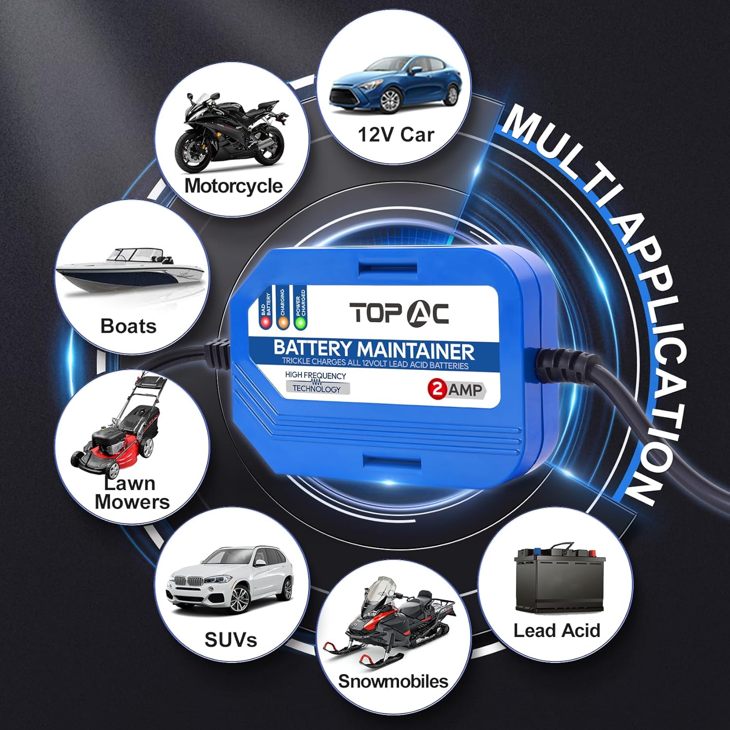• Poratable & Compact: Measuring just 5*3.5*1.38 inches in size, the TOPDC 2 Amp Car Battery Charger is compact and easy to store in your car or in your home