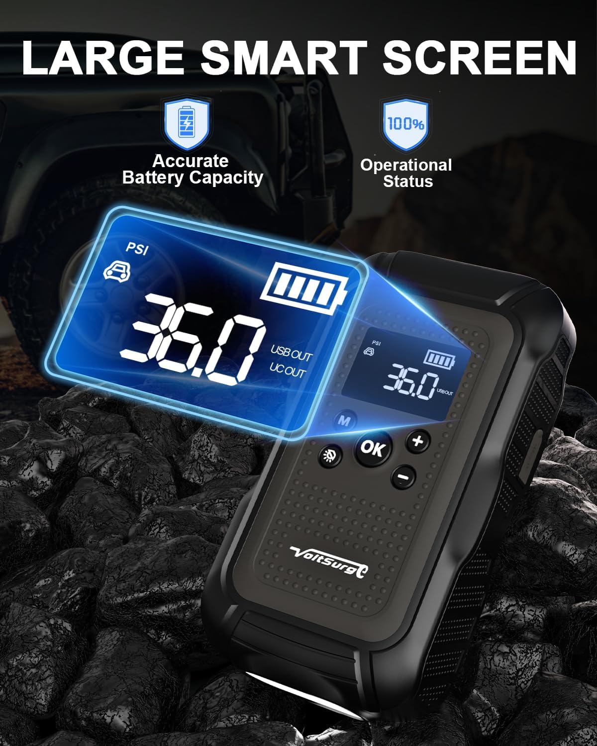- 【What You Will Get & Warranty】VoltSurge Jump Pack (1*Jump Starter with Air Compressor, 1*Smart Jumper, 1*Air Pump Hose, 3*Gas Nozzle, 1*USB-C Charging Cable, 1*DC Cigarette Lighter Adapter, 1*User Manual, 1*Portable EVA Carrying Case.) We offer a 2-year free warranty, lifetime technical support, and customer service