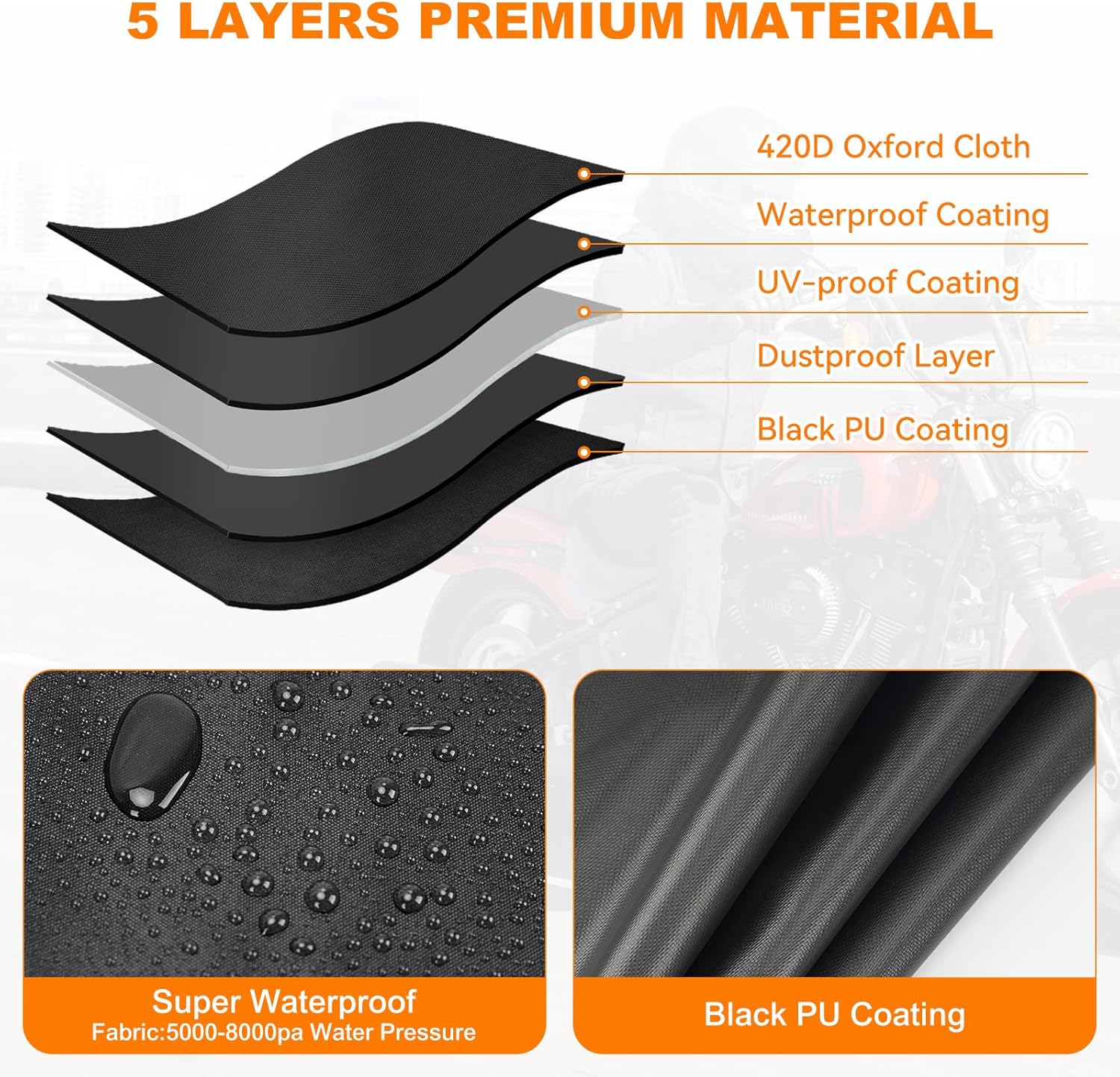 - ăHOW ABOUT THE DETAILSă1. Left and right sides each have a ventilation hole, which can prevent moisture under the cover. 2.Black PU waterproof coating: UV protection, high temperature protection, preventing the interior leather and plastic from cracking and deteriorating 3. Two full orange reflective strips to prevent collision at night and also help you find your motorcycle at a glance. 4. Anti-theft locking holes on the front wheel, perfect protection for your motorcycle, don't worry about losing your motorcycle.