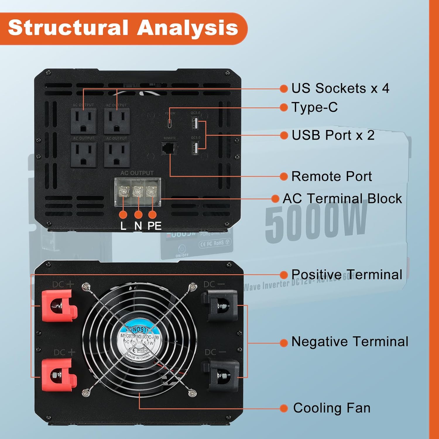 - Pure Sine Wave Technology: This 12v power inverter delivers pure sine wave, ensuring optimal performance for your devices. Converter 12V DC to 110V 120V AC 5000 watts continuous power and 10000 watts surge power, single phase, high frequency inverter, Ideal for vehicles, travel, power outages and off grid solar system.
