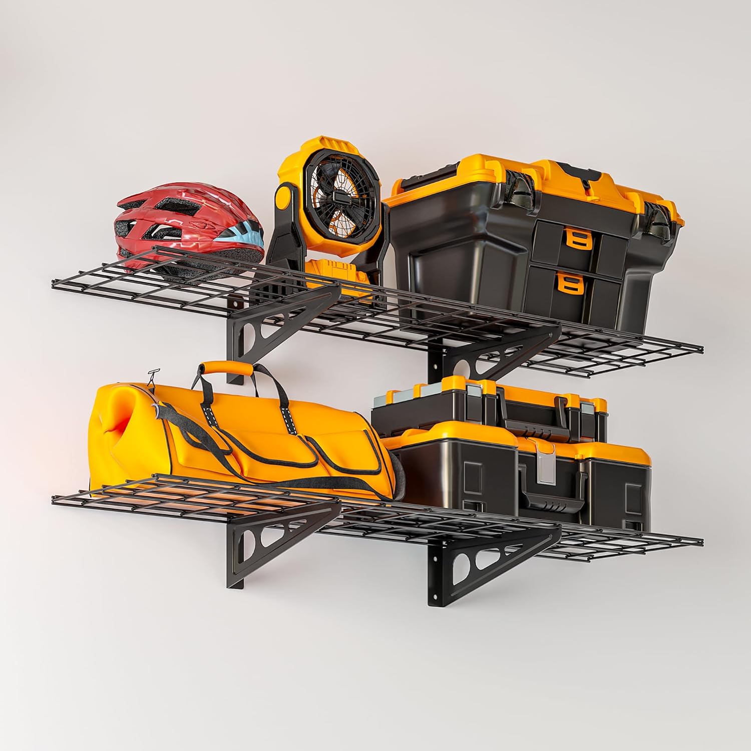 - High Load Capacity: The shelving can safely hold a total load of 300 pounds. Manufactured from high-quality materials, this garage storage rack has a sturdy and durable structure that can safely store a variety of items such as tools, utensils, boxes and more.