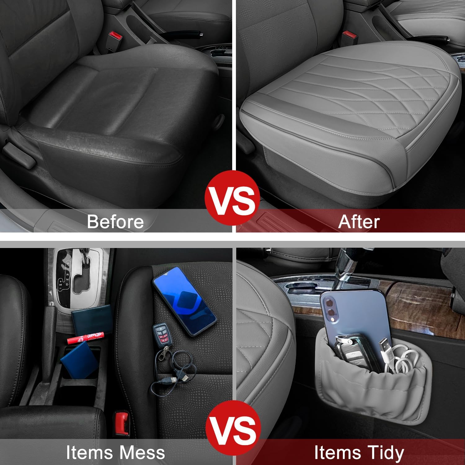 - Keep in place and easy to install: This front car seat cover has a non-slip gel bottom, with chucks and hooks to keep it in place well. It's also easy to install, insert the chucks into the gap between the seat back and the bottom, attach the hook under the seat bottom, then use the buckle to fasten the long elastic strap to the seat back, you can easily finish it in about 5 minutes Install.