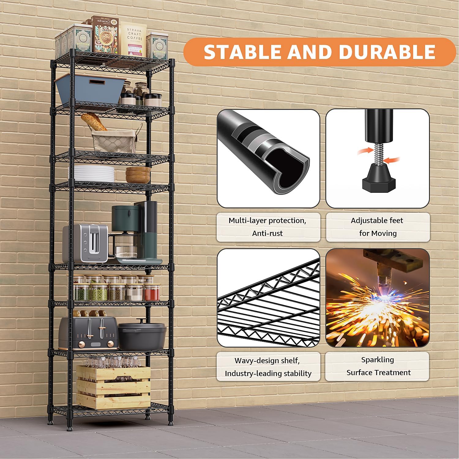 8 Tier 2000 lbs Storage Rack Metal Wire Shelving Unit, Storage Standing Shelf Organizer for Laundry Bathroom Kitchen Pantry Closet Garage Basement Utility Room, Black 13.8" D x 23.6" W x 79.5" H