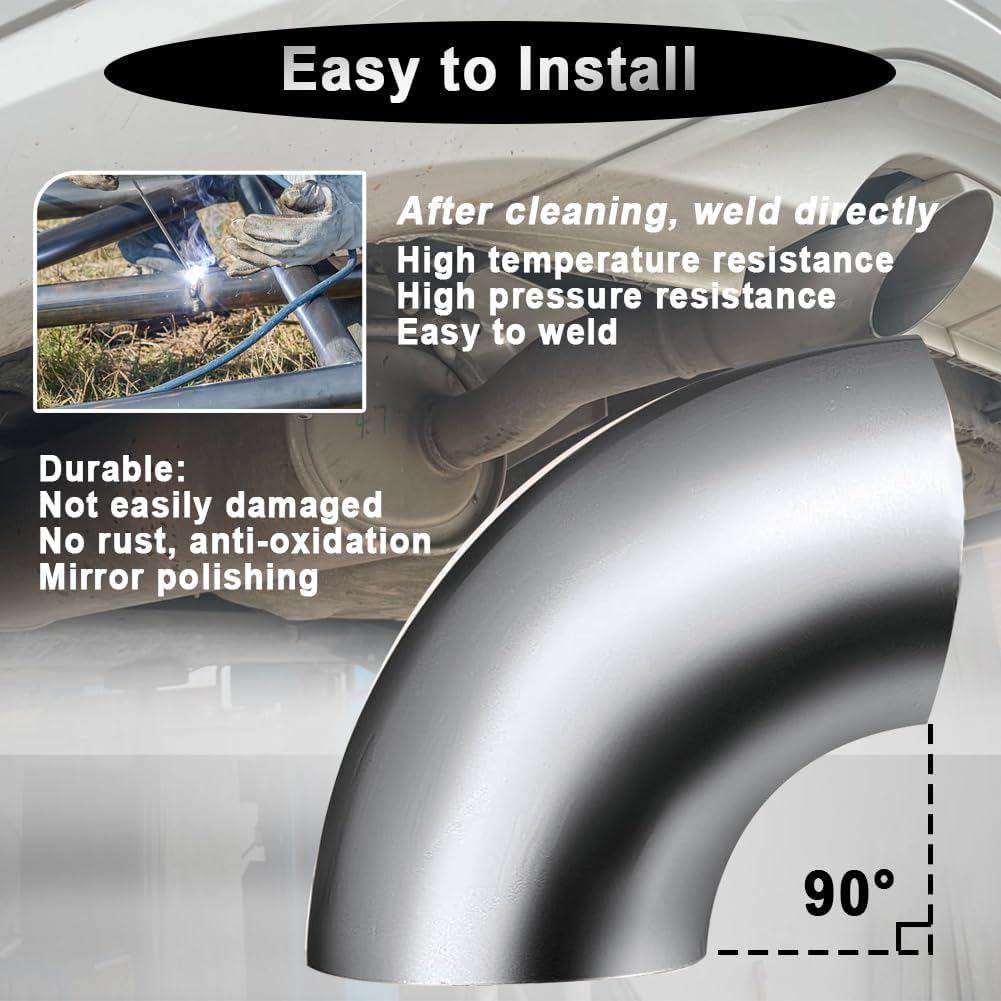 - [Parameter] High-quality SS304 stainless steel 90 degree exhaust elbow pipe, Caliber outer diameter is 3 inch/76mm. Thickness: 1.5 mm. Back arc length: 7.28 inches/185mm (can be welded to 3 inch outside diameter pipe)