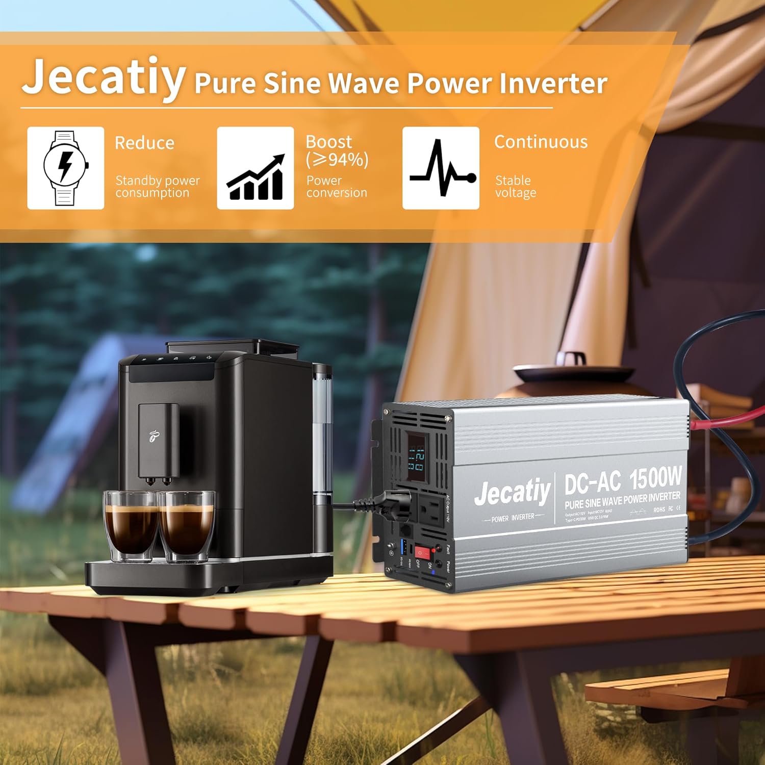 • 【1500W Pure Sine Wave Inverter】Jecatiy upgrade fully 1500W Power Inverter provides a continuous PURE SINE WAVE power of 1500W, with a peak surge of 3000W during load start-up. Tip: It can handle most appliances for you (including refrigerators, microwaves, or some power tools), as well as low-power devices. Note: The voltage of 110V is the actual display, and 100-120V is the supported range of the application