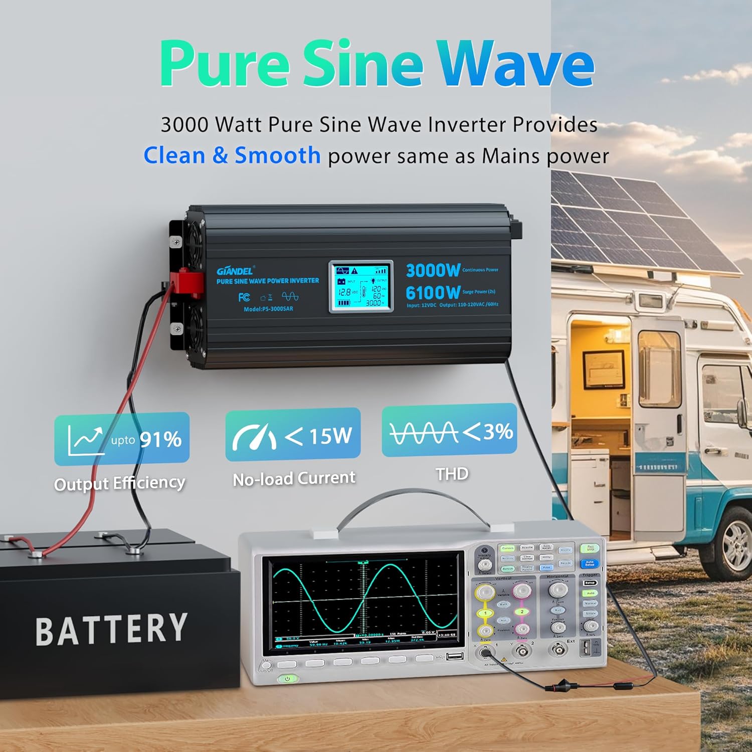 3000 Watt Power Inverter Pure Sine Wave with 6100Watt Surge for 2S 12V DC to 120V AC Converter,UL Listed GFCI outlets, Lithium Battery Compatible for RVs,Off-Grid Solar Power Inverter by GIANDEL