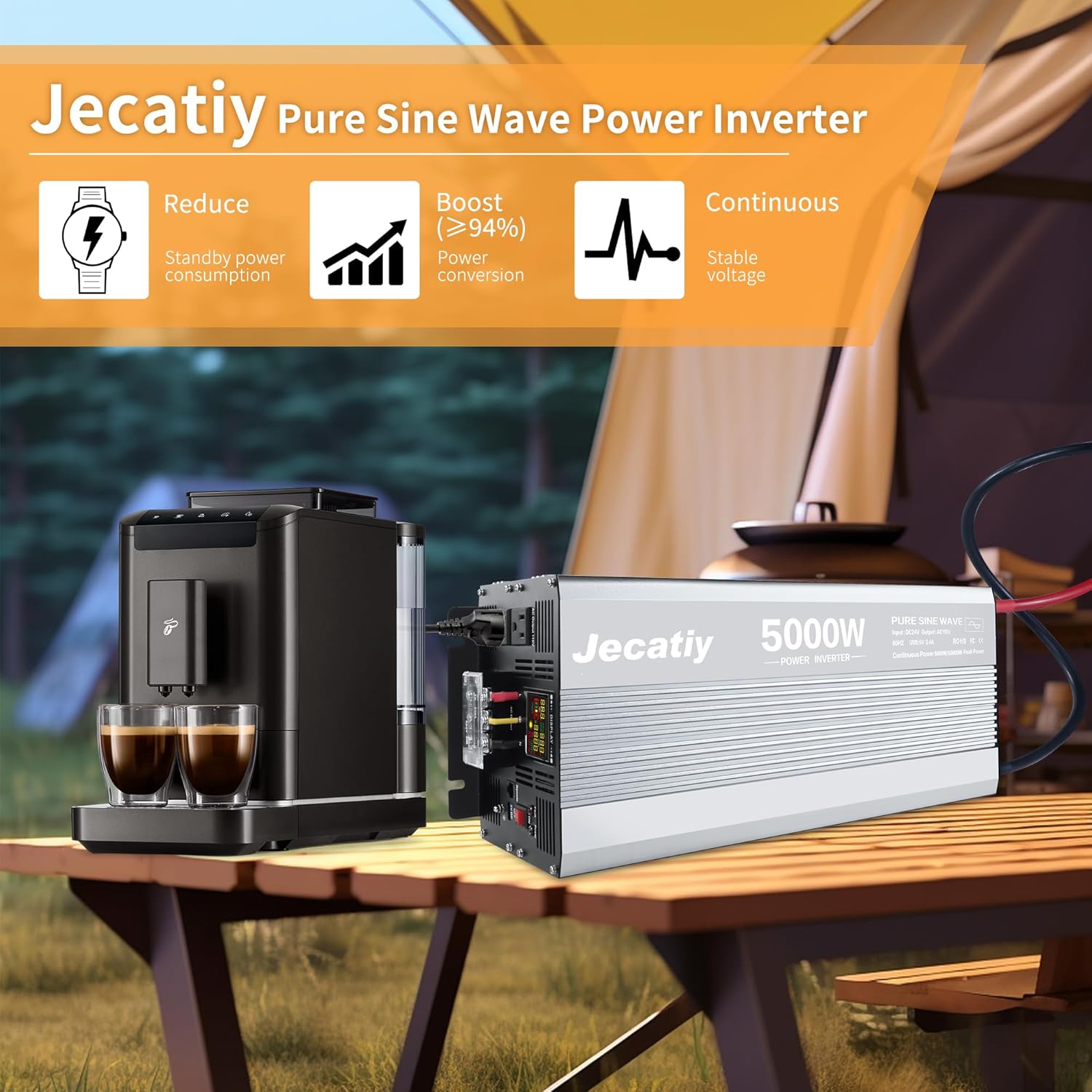 - 【5000W 24V Pure Sine Wave Inverter】Jecatiy upgrade fully 5000 Watt Power Inverter converts 24V DC to 110V/120V AC with 2 AC Charger outlets, 5V 500mA USB Charging Ports .The power inverter output efficiency can be up to 94%.The maximum peak value of a pure sine wave inverter is 10000W. Note: The voltage of 110V is the actual display, and 100-120V is the supported range of the application