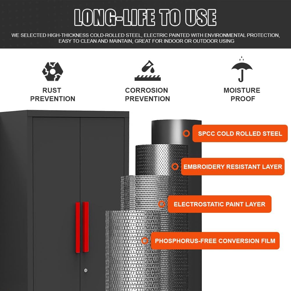 - Tool Organization - HPDMC Garage Storage Cabinet System is specifically designed for garage tool organization. It provides dedicated storage solutions for tools, ensuring that they are easily accessible and well-organized. The system features a black and red color scheme, adding a stylish and visually appealing touch to your garage or workshop.