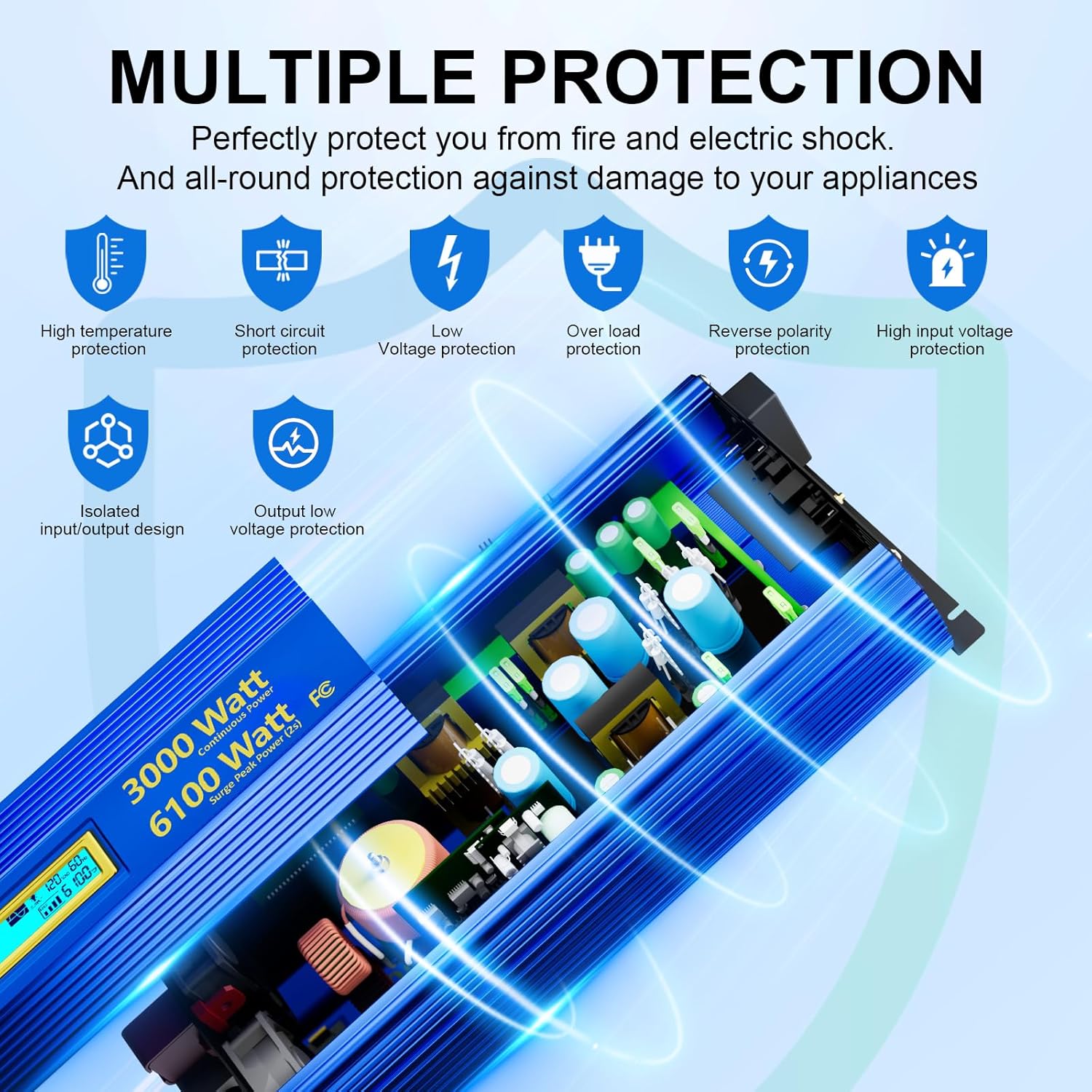 - 【Advanced Protection】3000W pure sine wave inverter including Short circuit protection, Input over-voltage/under-voltage protection, Output short-circuit protection, Over-load protection, Over-temperature protection, Low-input alarm. Durable Aluminum Housing can protect inverter from drops and bumps,and good heat dissipation.