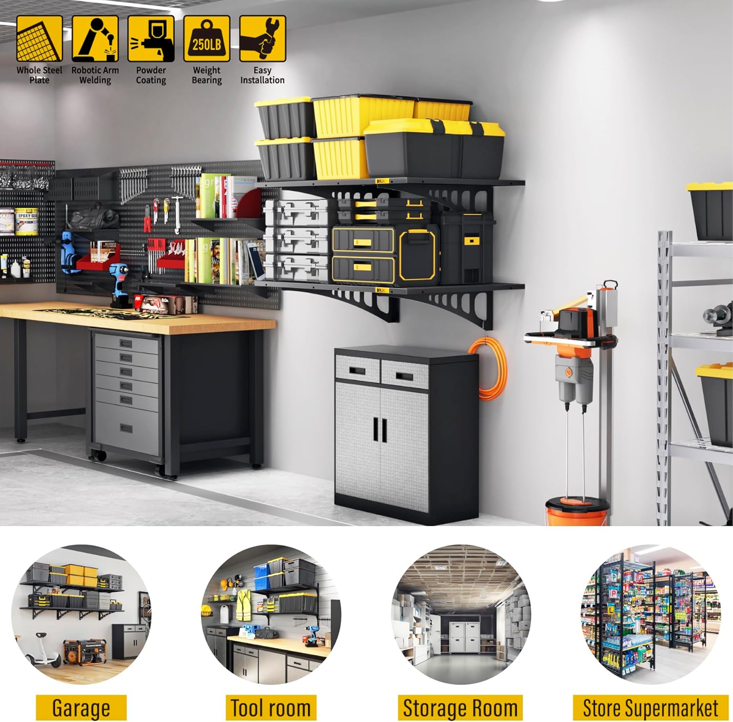 - STABLE AND SAFE: The wall storage rack is reinforced and safely designed for each connecting pivot point, The four sides are made of rectangular square tube frame structure combined with 2 support rods welded in the middle, And the surface is made of professional matte fine-grained high-temperature powder baking varnish. And the single piece of safe load-bearing is up to 251 pounds