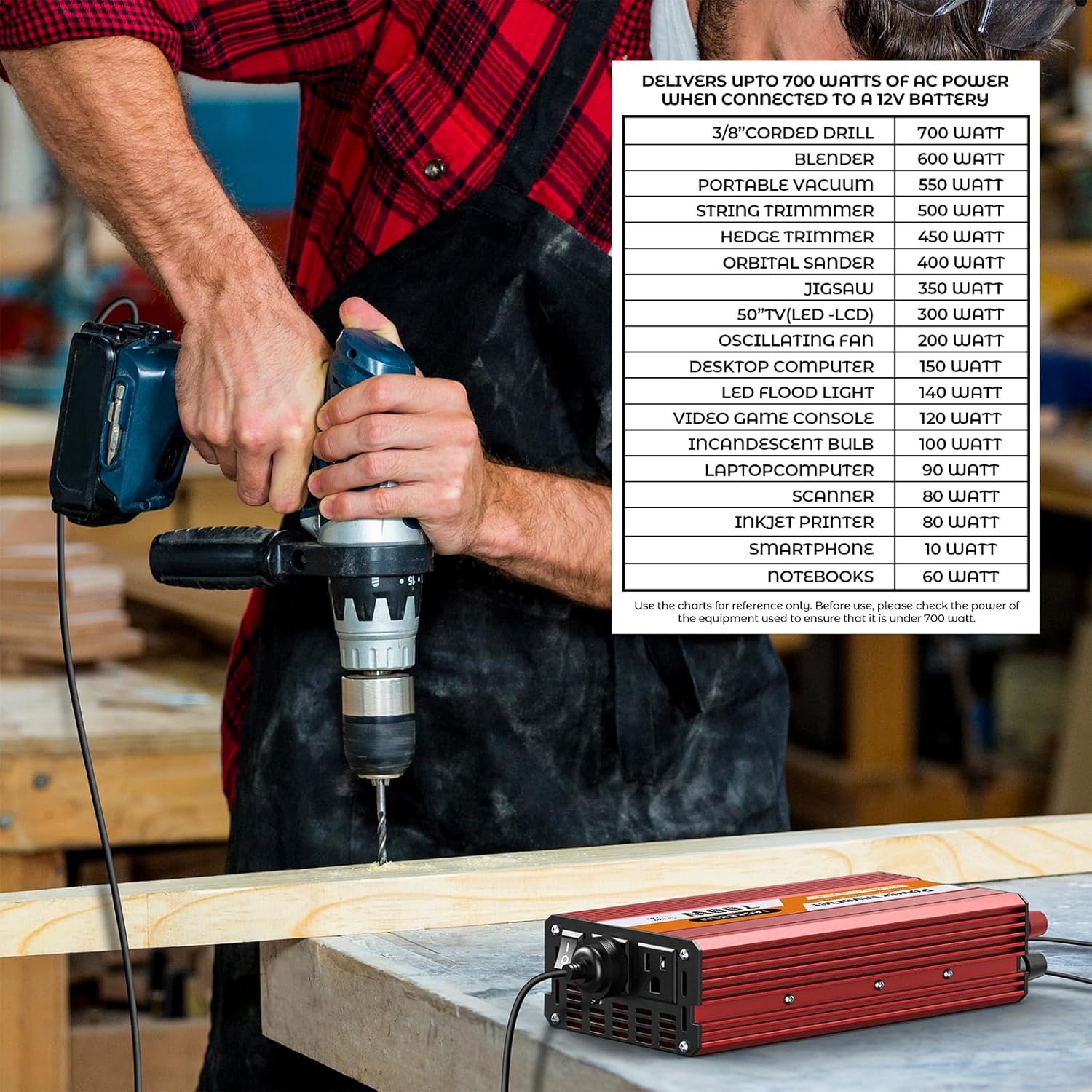 - 【Premium 700W Modified Sine Wave Power Inverter】This power inverter 12V to 110V provides 700W continuous DC to AC power, 1400W peak surge during load start-up, 12V to 120V AC modified sine wave with conversion efficiency >90%, 2 AC outlets and digital LCD display.