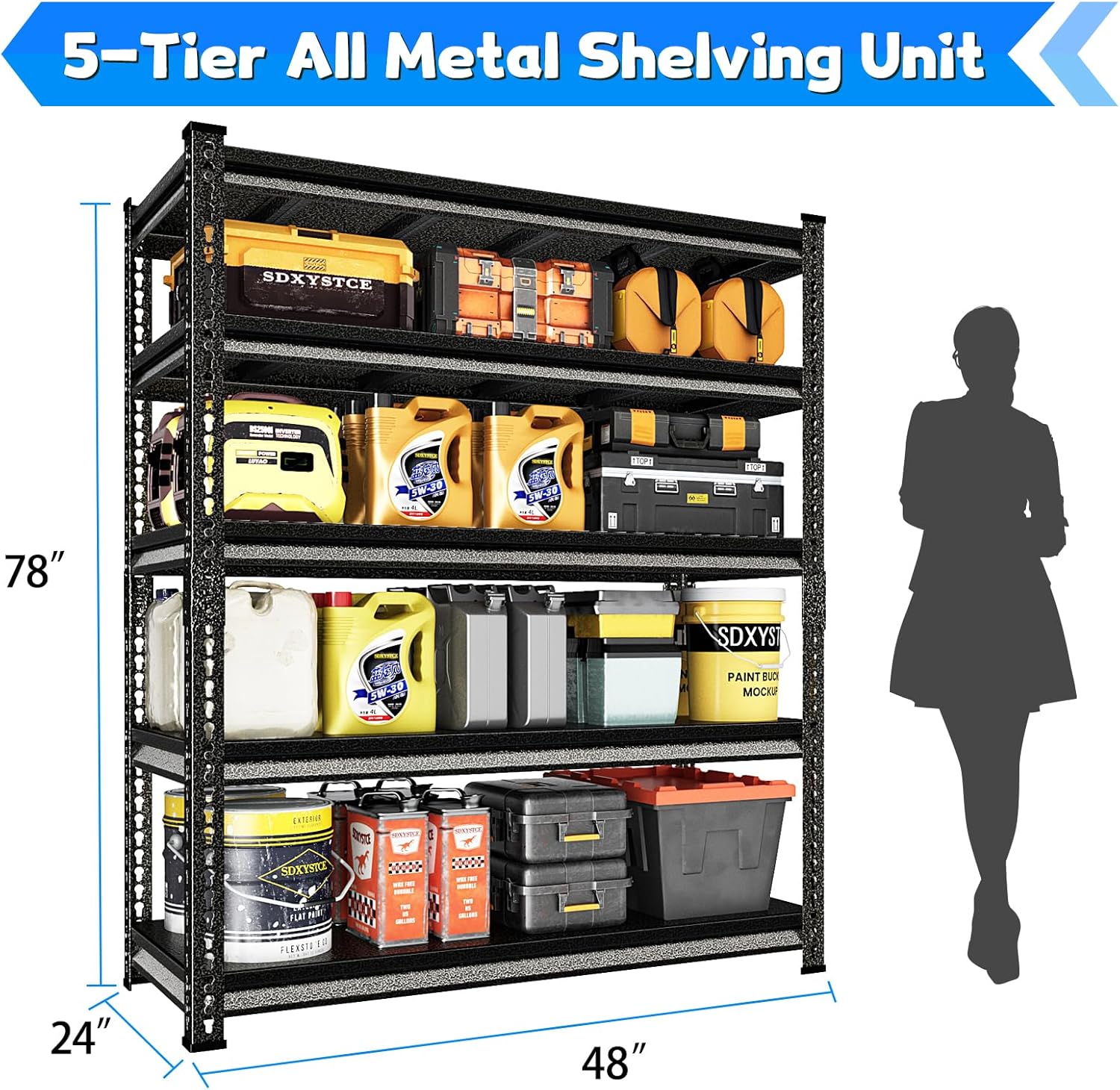 - 【3000 lbs Load Capacity】SDXYSTCE 5-tier garage organization shelves is made of heavy duty steel, every solid thickened metal shelf with 3 big ribs beneath can hold up to 600 lbs.The garage shelves heavy duty offers a high total weight capacity of 3000 lbs for organizing heavy-duty stuff and tools in your garage or warehouse.
