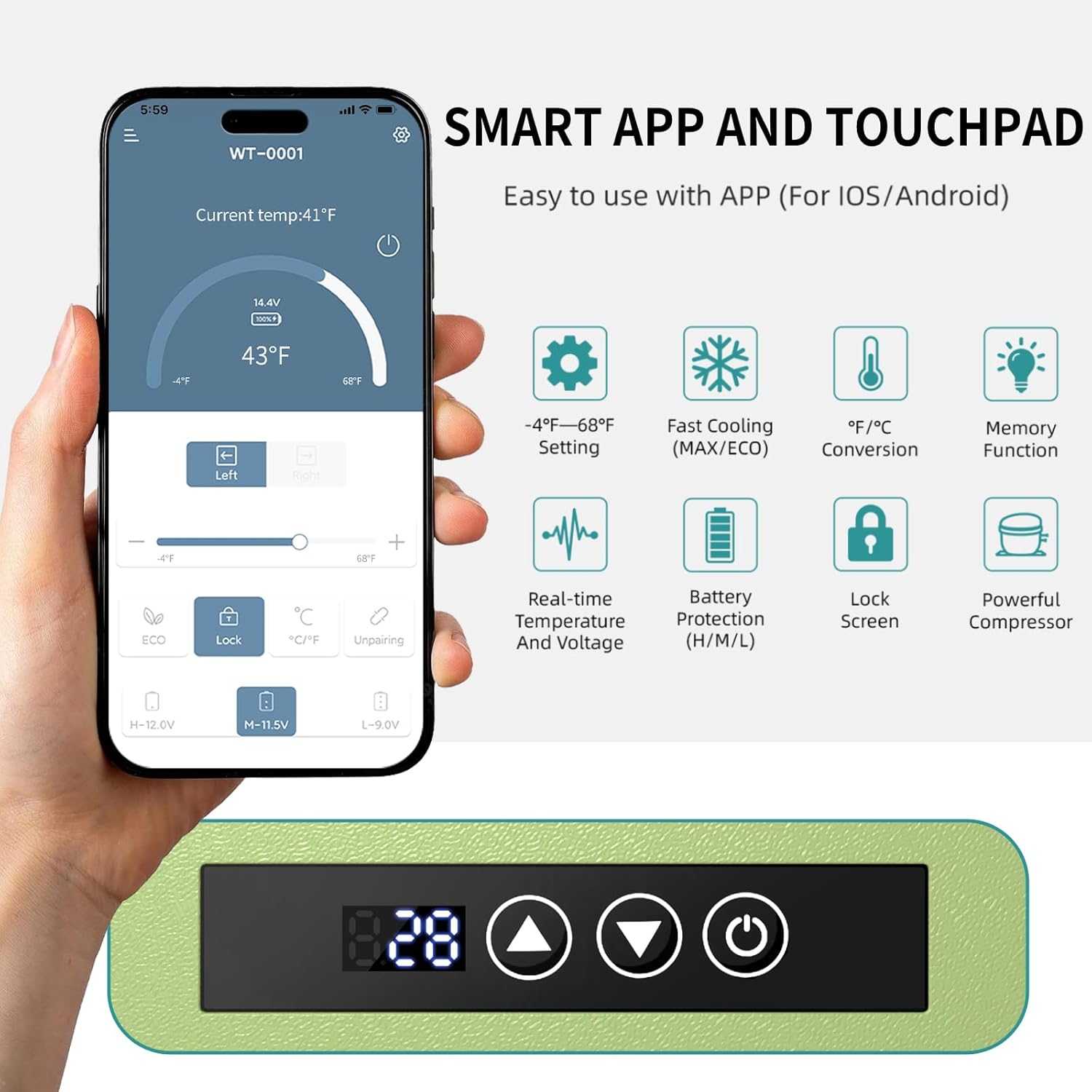 - Multiple Power Connection Options:Our 12v portable car refrigerator comes with a DC12V/24V power cord and a AC/DC adapter, can easily connect to the port of a car/RV, home outlet and external power source like solar panel and power station. Upgraded three-level battery protection function (L/H/M), means you don't have to worry about the refrigerator draining the car battery and not being able to start the car, no matter short trips or long-distance trekking, rest assured in SUVs, trucks, RVs or campervans