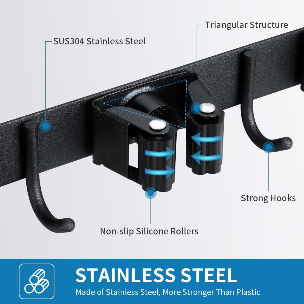 - 🏠【NON-SLIDE DESIGN】Each rack of the mop and broom holder wall mount features an adjustable triangular design. The spring-loaded, double rubber gripped slots can keep a stronger hold on your items. It's non-slip high elasticity clips can holds your broom, mop, umbrella or other garage tools firmly.