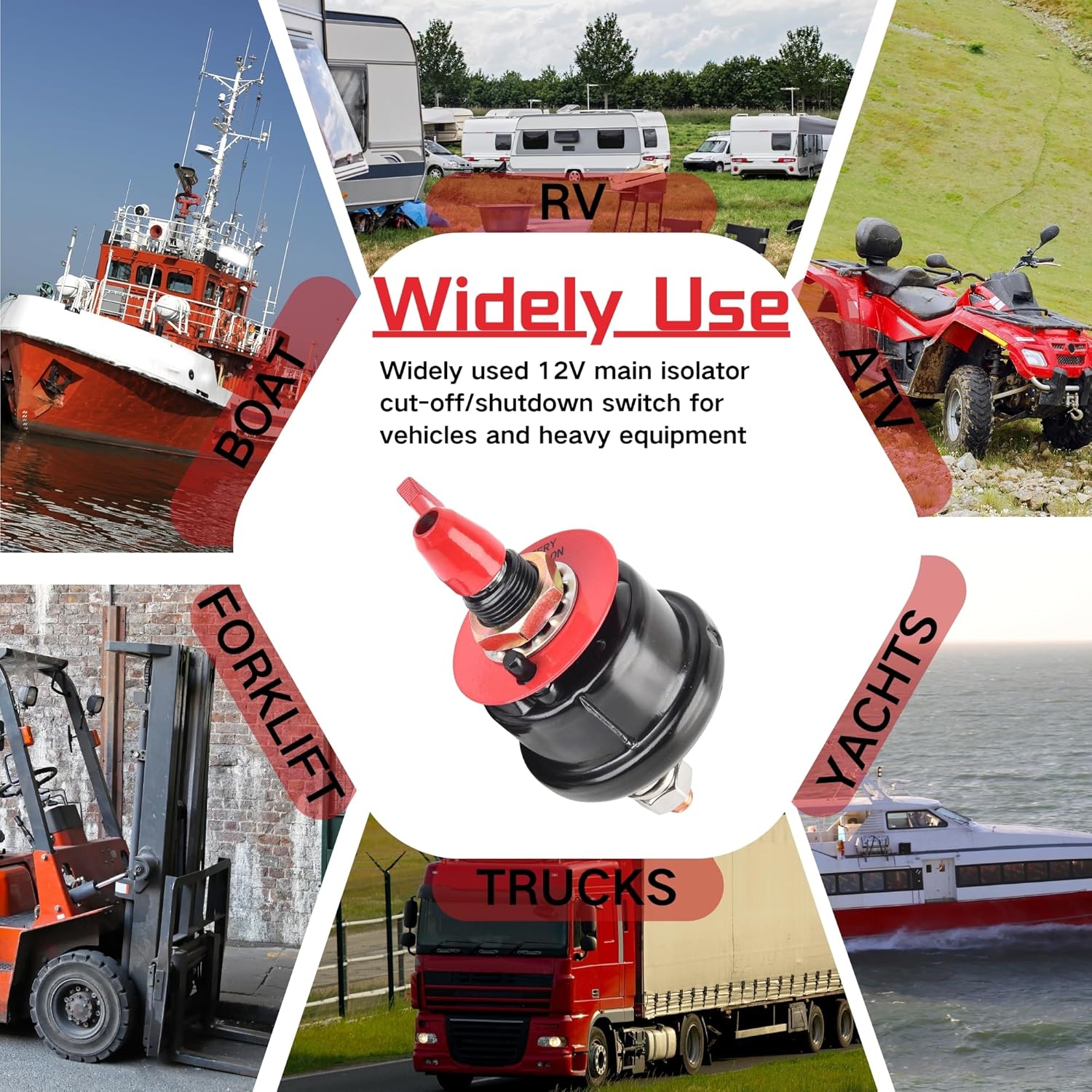 - 【Versatile Use】12V Battery Switch for Cars, RVs, ATVs, Boats, Yachts, Forklifts, Trucks,Engineering vehicles and Heavy Equipment