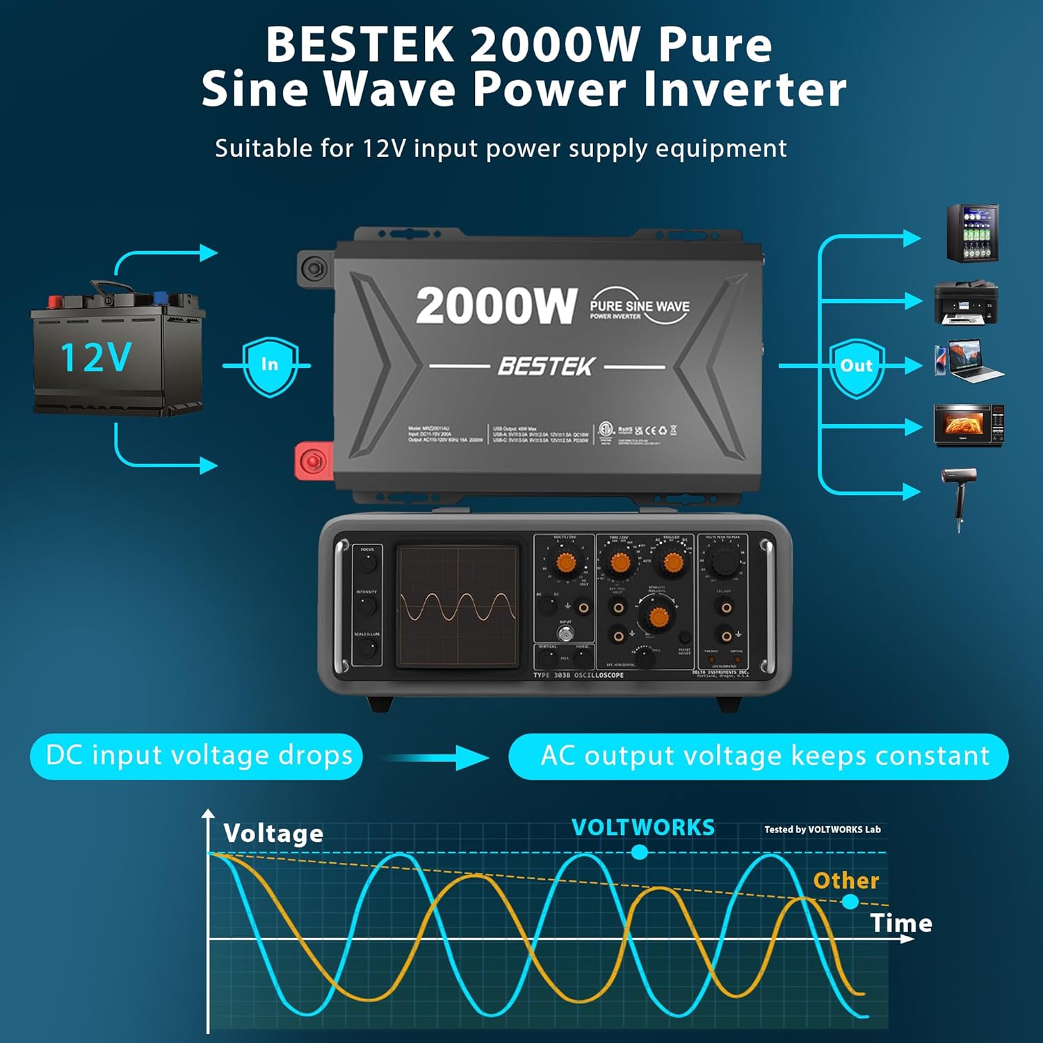 • BESTEK 2000W Pure Sine Wave Car Inverter:Power inverter 12V DC to 110V/120V AC with 4000W peak power,Its output waveform is same as the AC power waveform of mains power grid which delivers a smoothly-varying sine wave for sensitive electronics provided by the electric utility.Perfects for off-grid system,Lower THD,Less wear,Strong inductive Loads Capability.It has little interference with radios, communication and precision equipment.It ensures seamless and smooth operation of your devices.It's also recommended by most cordless tool manufacturer that a pure sine wave inverter is used to ensure long battery life