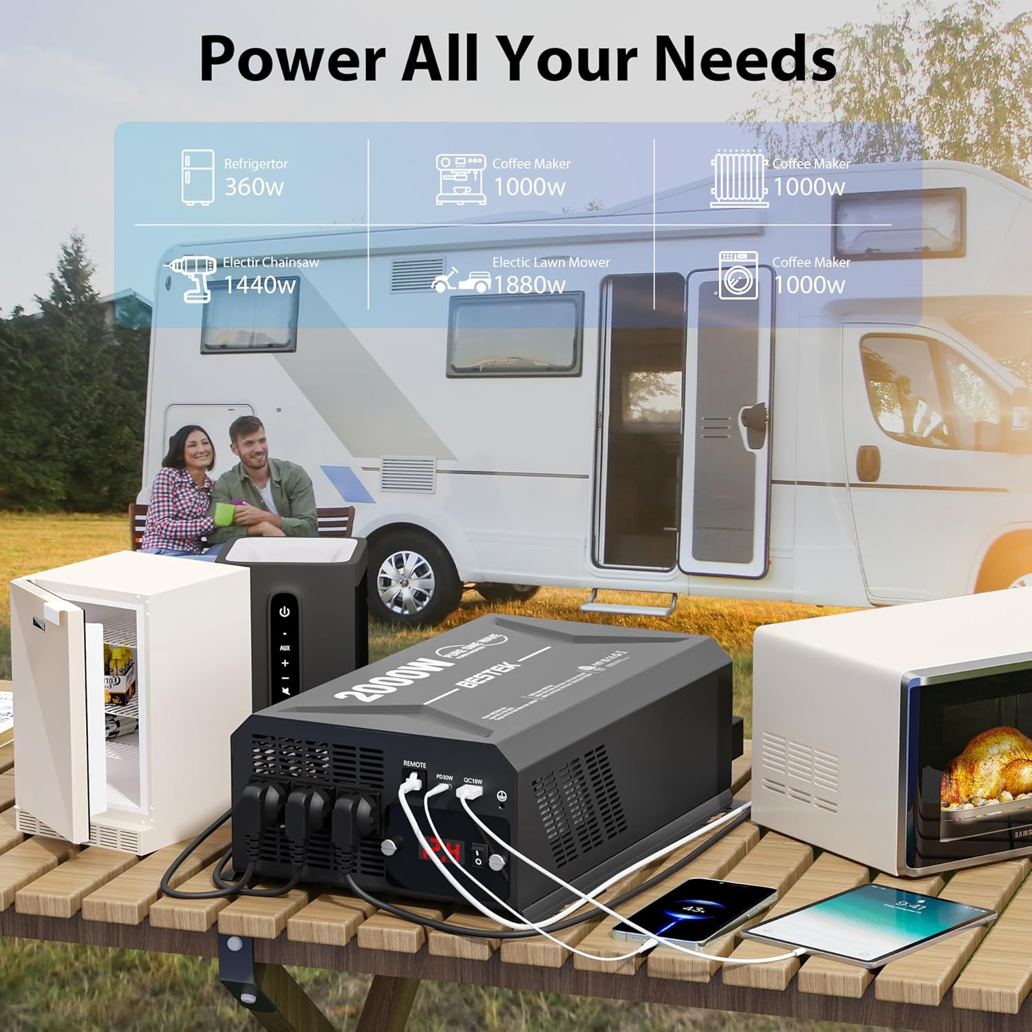 • Multiple Outlets & Compatible with All Battery Types: 2000 watt pure sine wave inverter comes equipped with 3 standard U.S. AC outlets, USB-A(QC18W) and Type-C(PD30W) fast-charging ports. It is compatible with all types of 12V batteries, catering to your various power needs whether you're on an RV trip, camping, road tripping, living off-grid, or in an emergency situation, providing stable power supply. It is suitable for all U.S. electrical appliances, up to 2000W. with an impressive conversion efficiency of over 90%