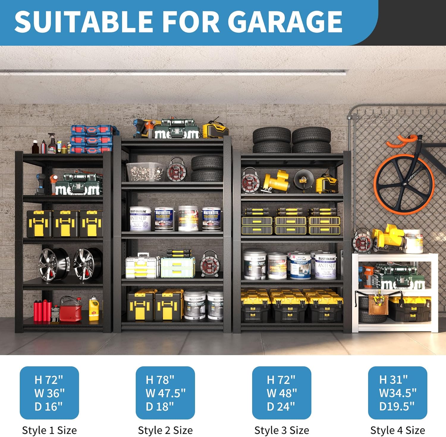 - 31.5''H*34''W*18''D Heavy Duty Storage Shelves:This garage storage shelves is made of superior quality cold rolled steel, and the surface of the metal shelves is powder coated, waterproof and fireproof. Higher and wider storage shelves to meet your large capacity needs.
