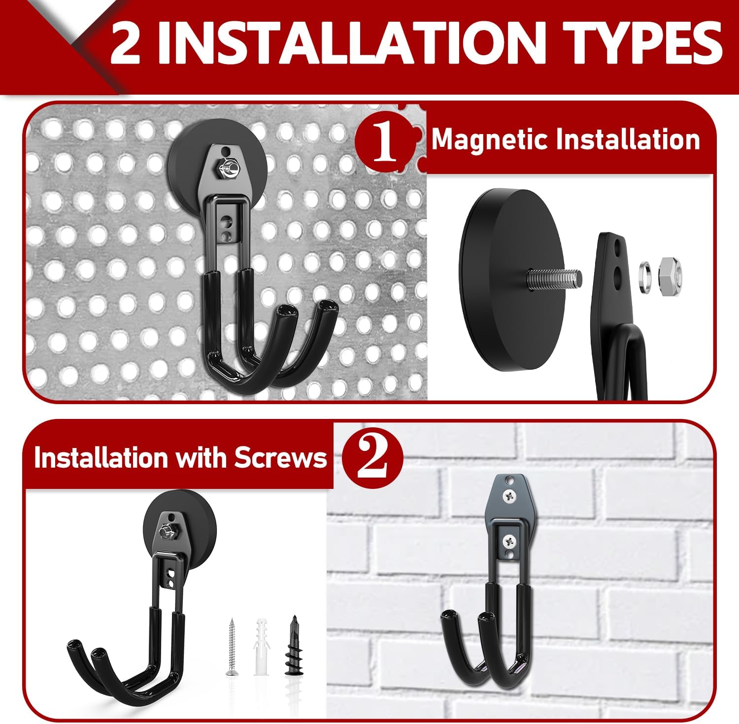 - Easy To Install Strong Heavy Duty Hooks: 2 usage options available: (1) heavy duty magnetic hooks for garage can be adsorbed on any metal surface. No tools, drilling, or screws are required for installation, ensuring no damage to the surface. (2) Alternatively, you can remove the magnet and use the garage storage hooks independently. For storing heavier tools, we provide sturdy screws that can be used to securely install the heavy duty hooks for garage on any wall surface