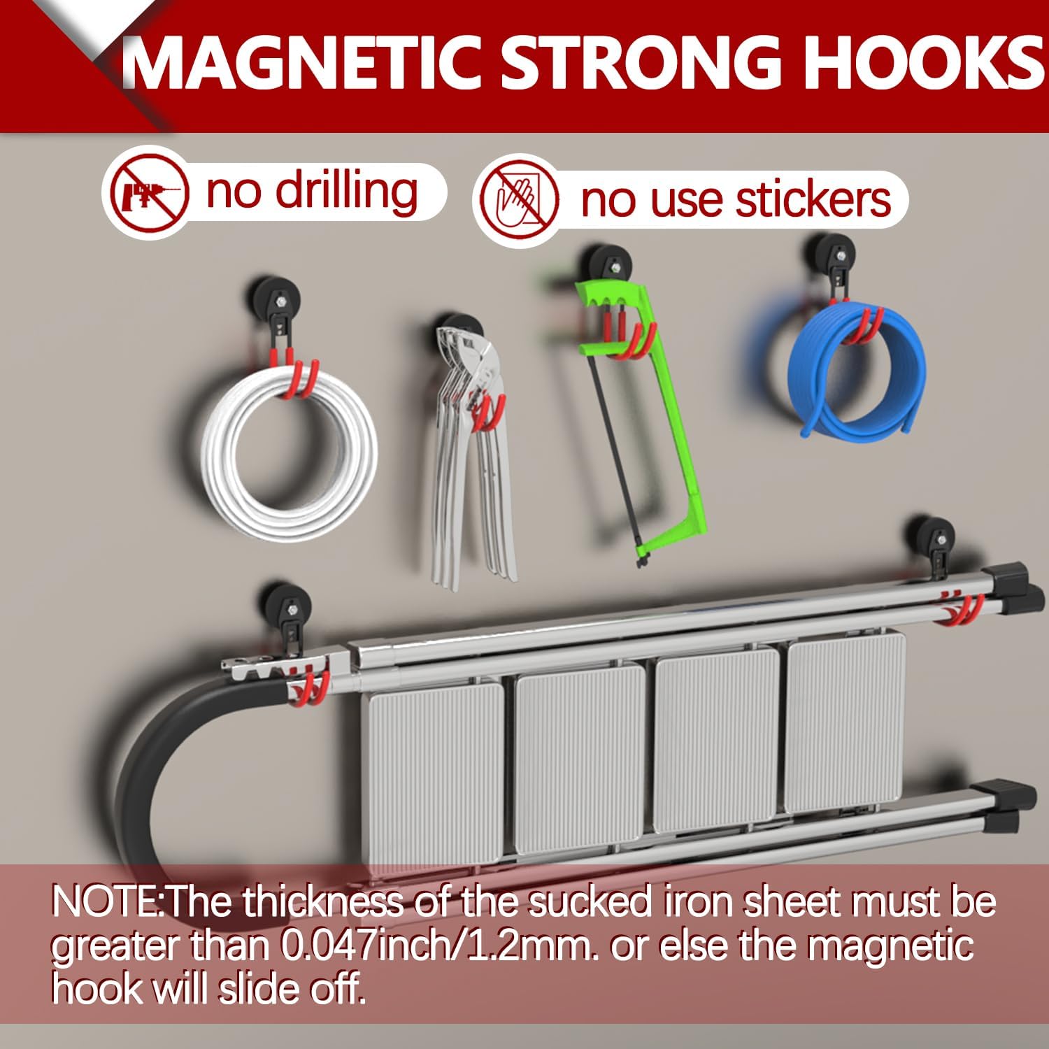 - Efficient Vertical Storage Solution: Discover the ultimate space-saving solution with our strong magnetic hooks. Versatile and reliable, these hooks are perfect for a multitude of environments, including garages, kitchens, offices, warehouses, gardens, and basements. These magnet hooks heavy duty help to reduce clutter and maximize available space, accommodating a variety of tools and equipment, including hoses, ropes, shovels, wires, cables, rakes, and more