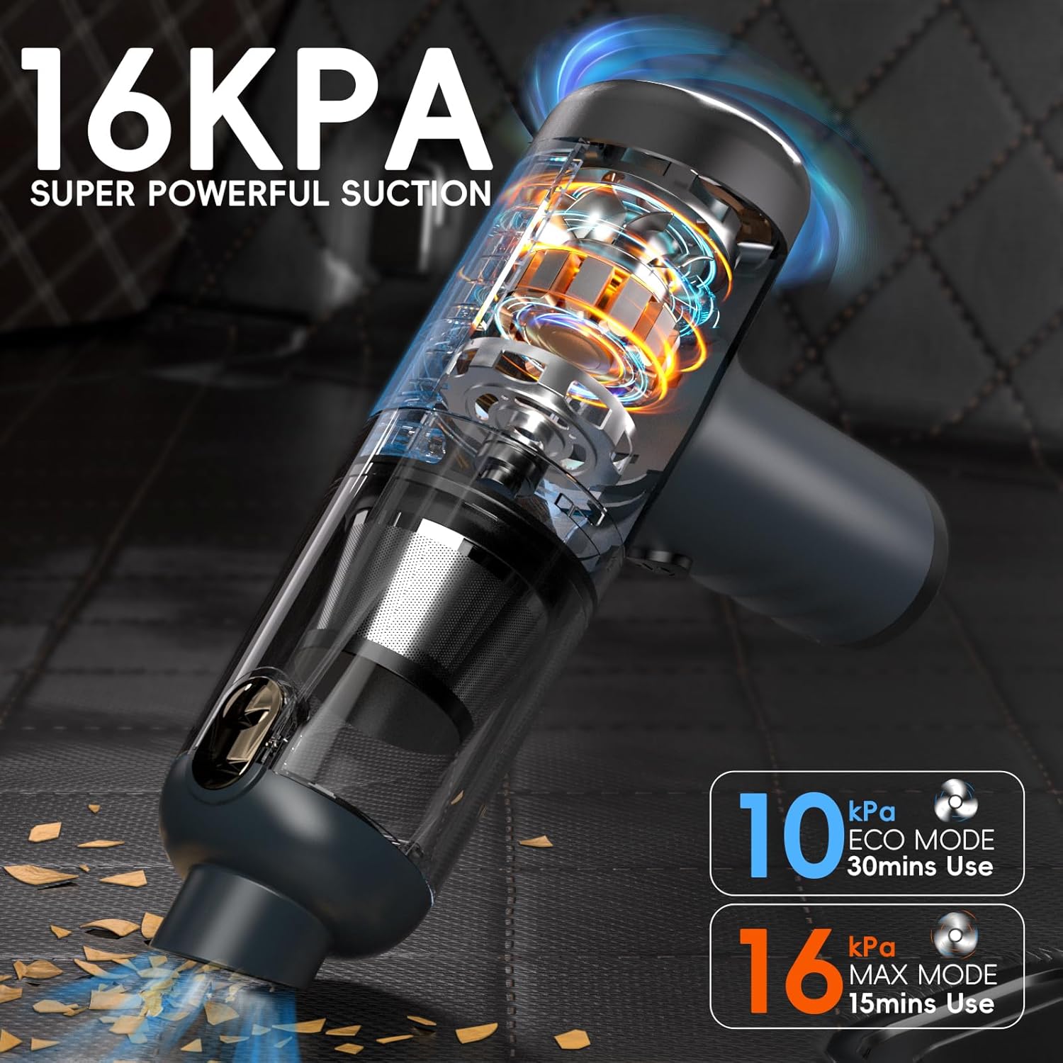 - MAX 16Kpa/120000RPM& 2 MODES: The car vacuum cleaner high power uses a 80W brushless motor that can provide a strong suction force of 16Kpa and 120000RPM high-speed wind force. It provides two cleaning modes: min-10Kpa and max-16Kpa. Switch the suction mode by pressing the switch button, and press the power button for 3 seconds to turn it off.