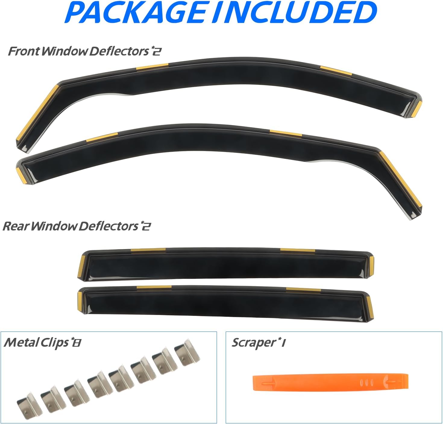 - DURABLE MATERIAL: Vent window deflectors made from high-quality and durable anti-shatter material thatβs scratch resistant, will not be easy to crack, break, or chip. Created specifically for your vehicle's make and model to ensure sleek and streamlined appearance