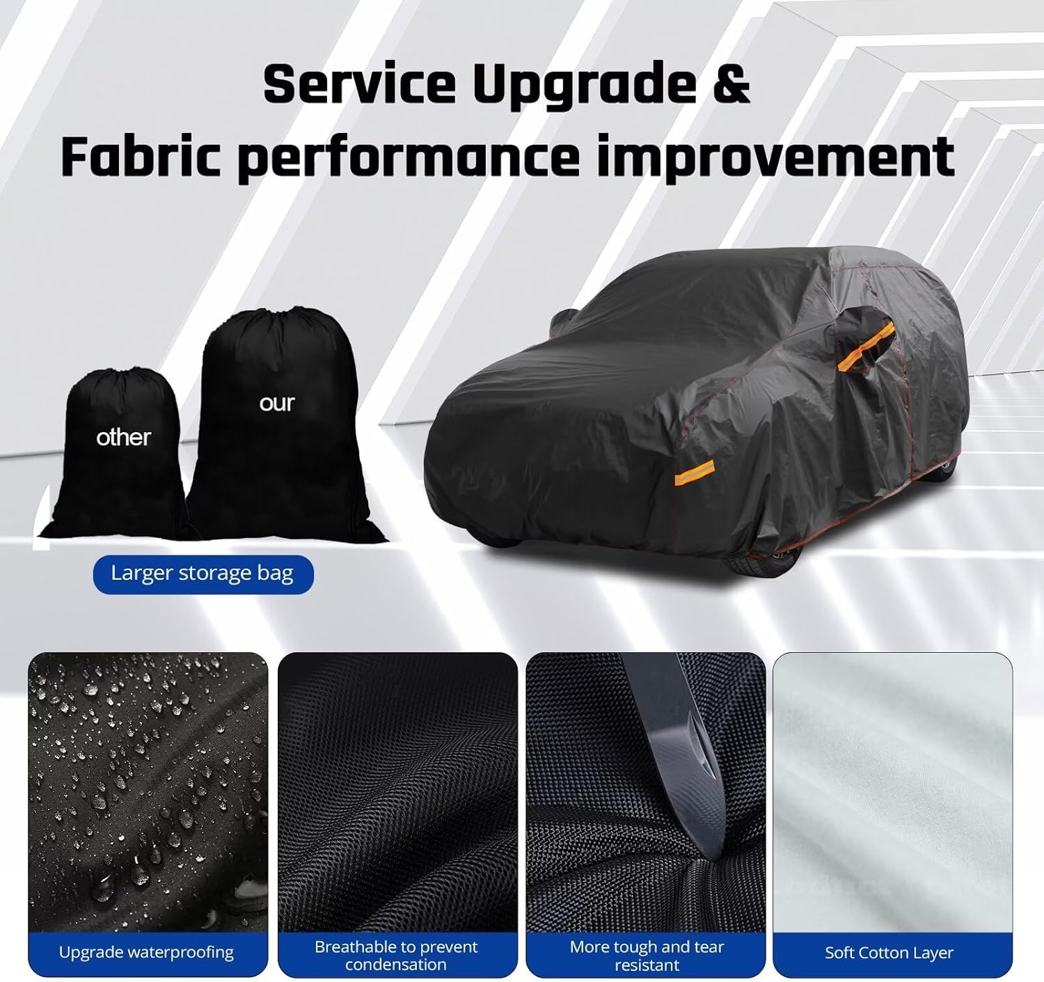- 【Design Upgrade,Durable Quality】- Professional designers design semi-customized stylish car cover for suv sizes 178 to 181 inches. (not applicable to hatchbacks and Sedans). 1. Mirrored pockets cover all sizes of the range, thickened soft cotton cloth protects the vehicle from painting. 2. Quality upgrade and exquisite craftsmanship make the car cover more durable. 3. The weight is just right and comes with a large storage bag for you to store and carry at any time.