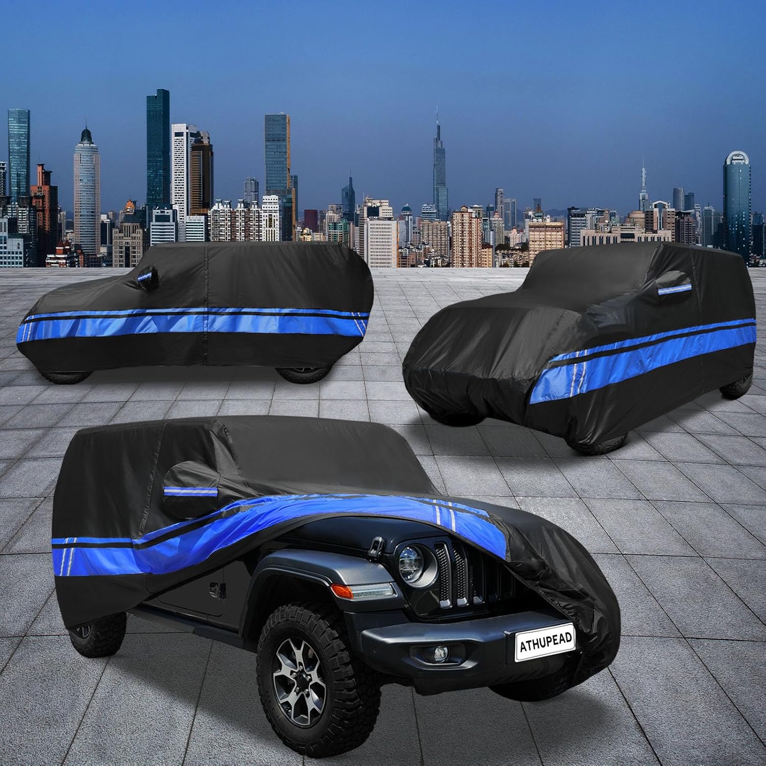 - 【Multifunctional Design】1.ATHUPEAD Jeep Waterproof 4 door has a door zipper on the driver's side. 2. Unique reflective strip design to remind others at night. 3. There are vents on the side of the car cover. 4. There is a front logo on the front of the car cover. 5. The car cover provides an antenna eyelet kit.